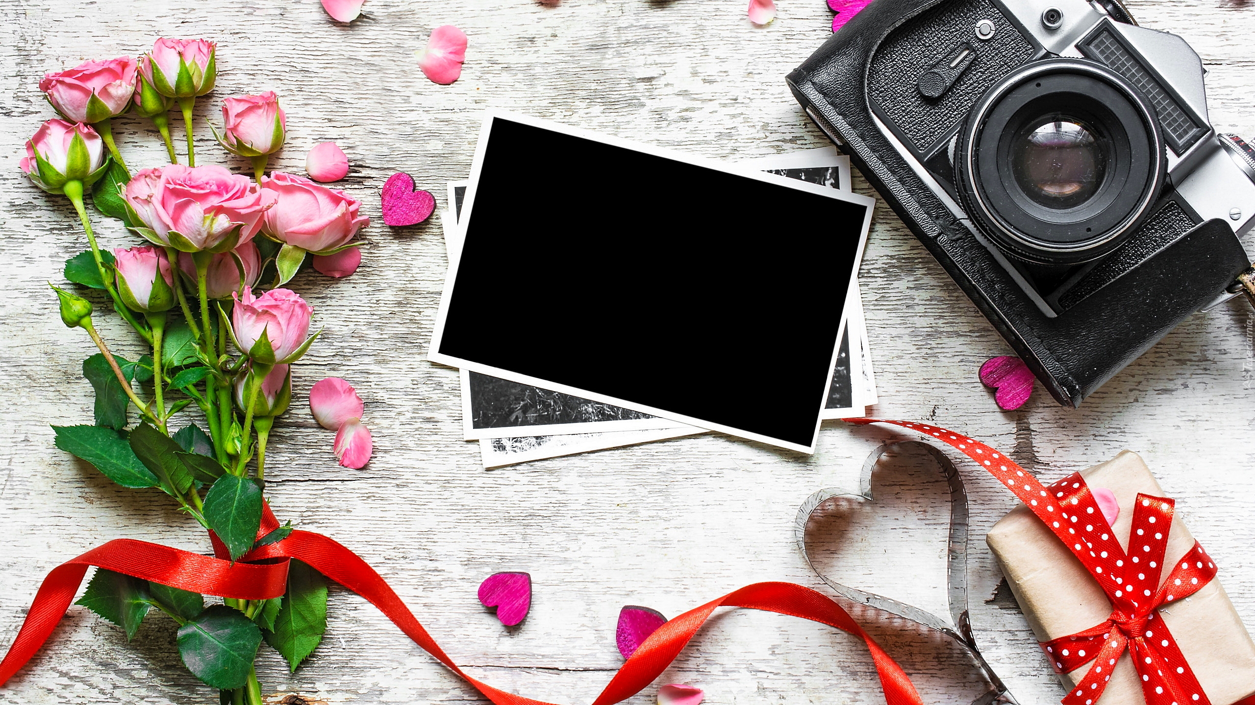 Edytor tapety: Róże obok zdjęć i aparatu