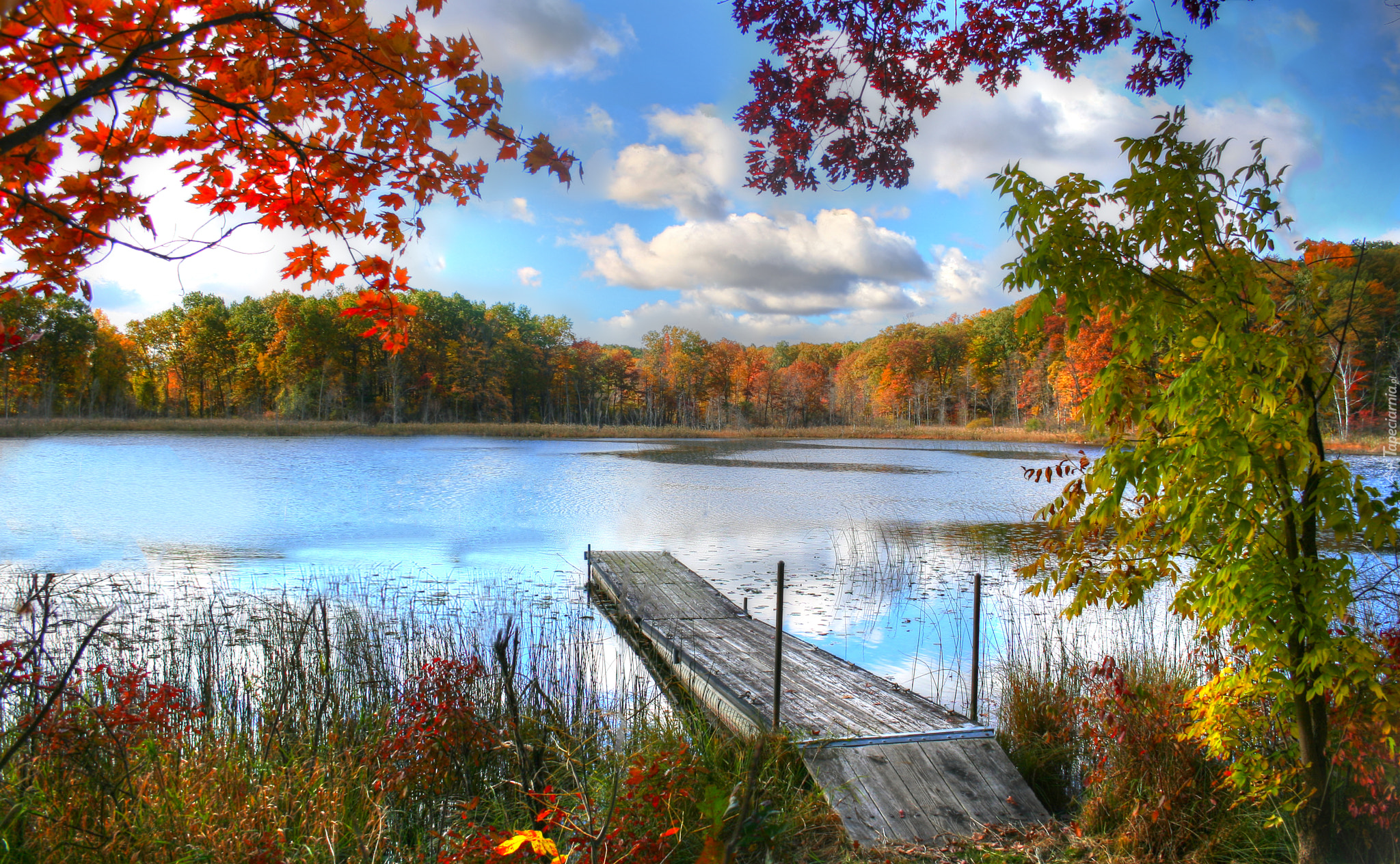 Edytor tapety: Pomost na jeziorze pod jesiennymi drzewami