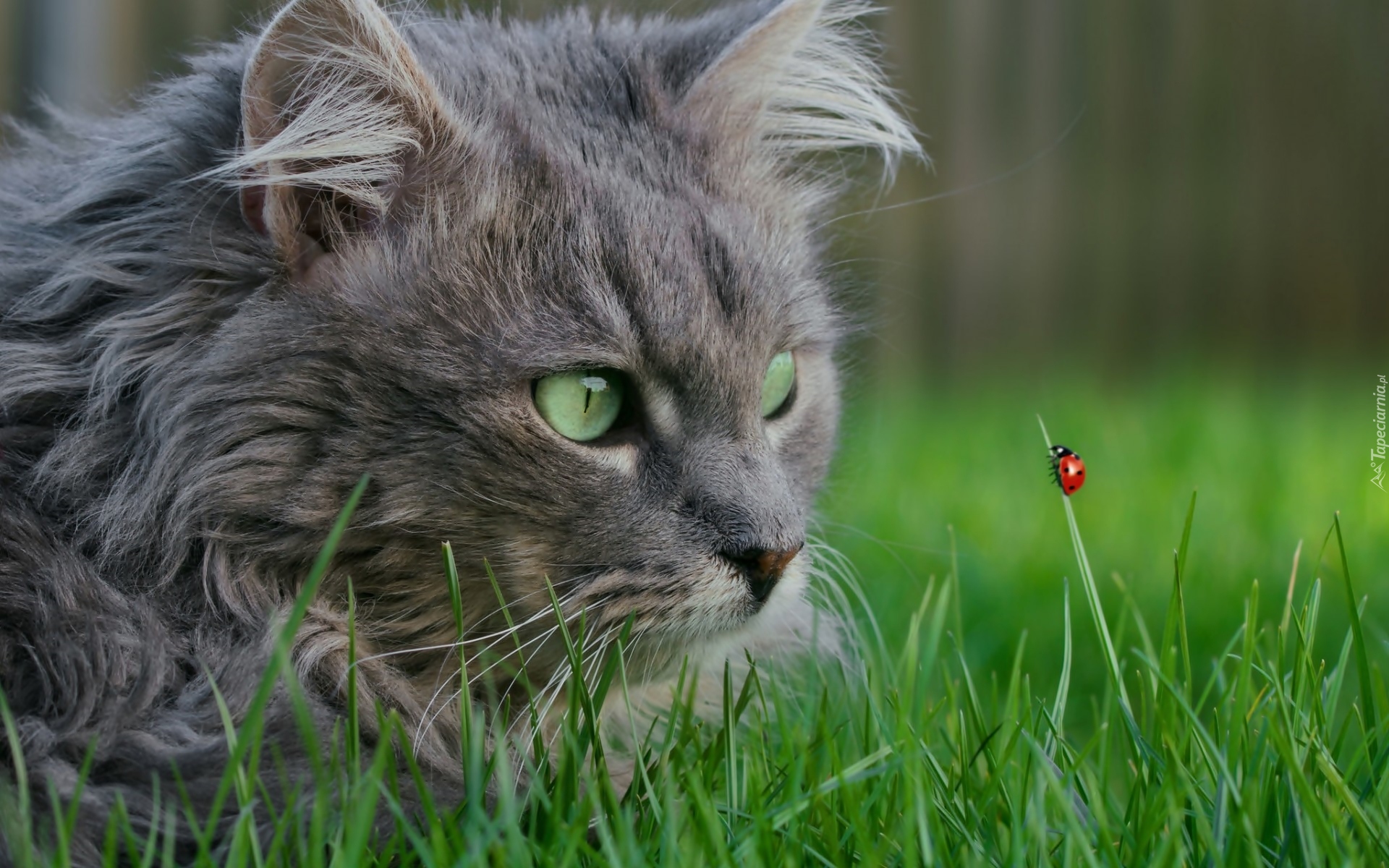 Edytor tapety: Szary kot obserwujący biedronkę na źdźble trawy