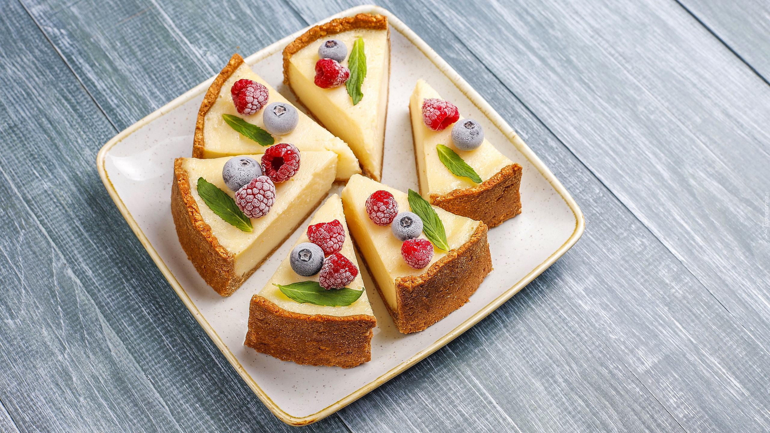 Edytor tapety: Kawałki sernika ozdobione owocami
