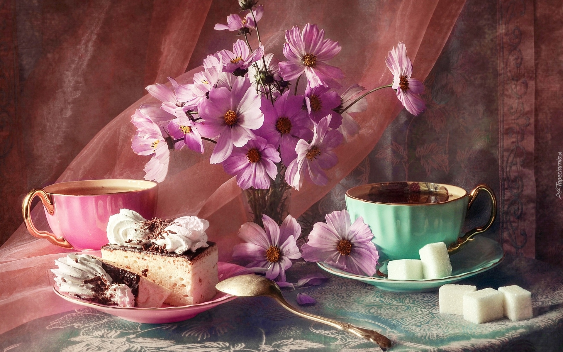 Edytor tapety: Różowa kosmea w wazoniku obok ciasta i filiżanek