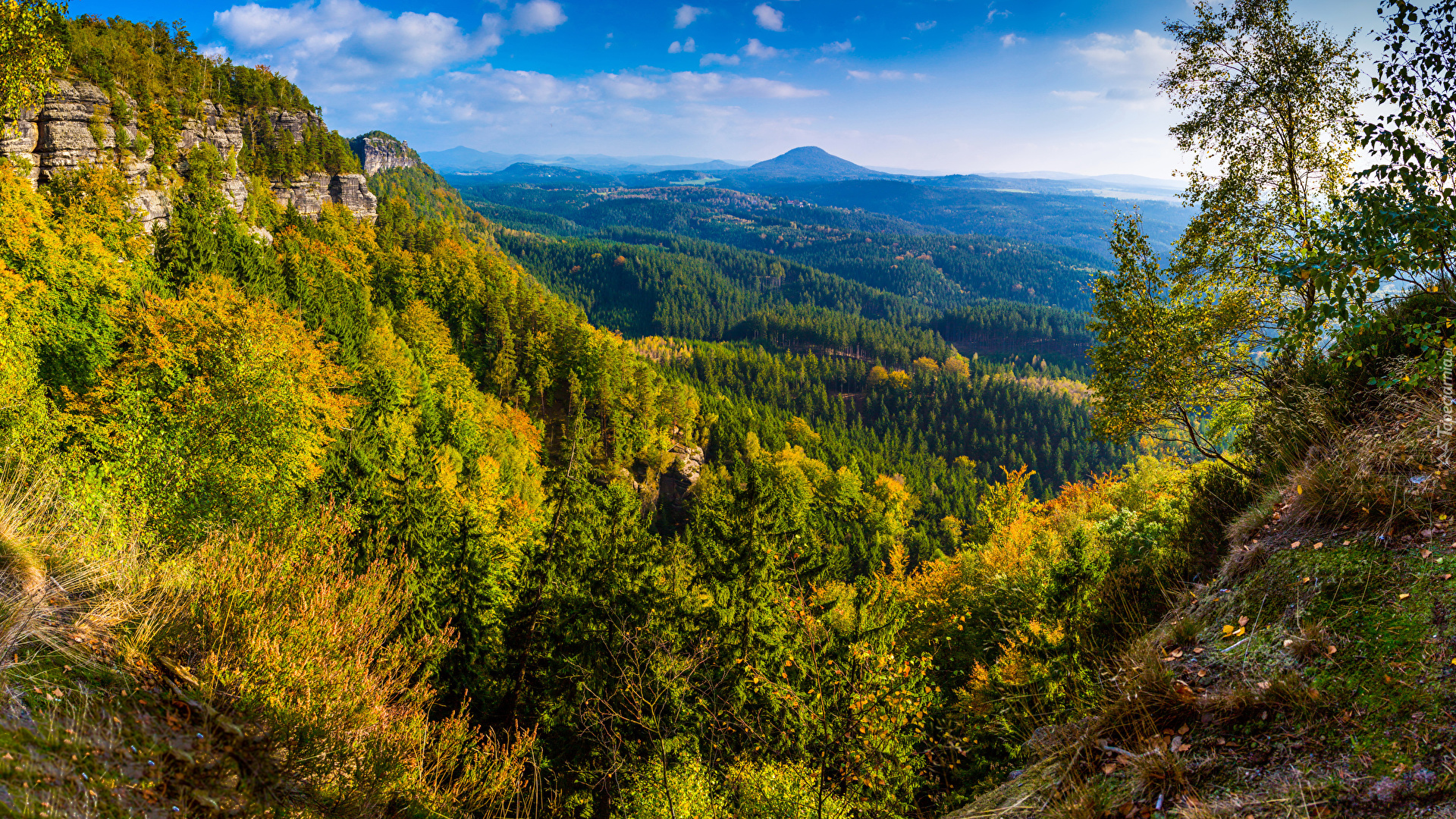 Edytor tapety: Skały na zalesionym stoku góry