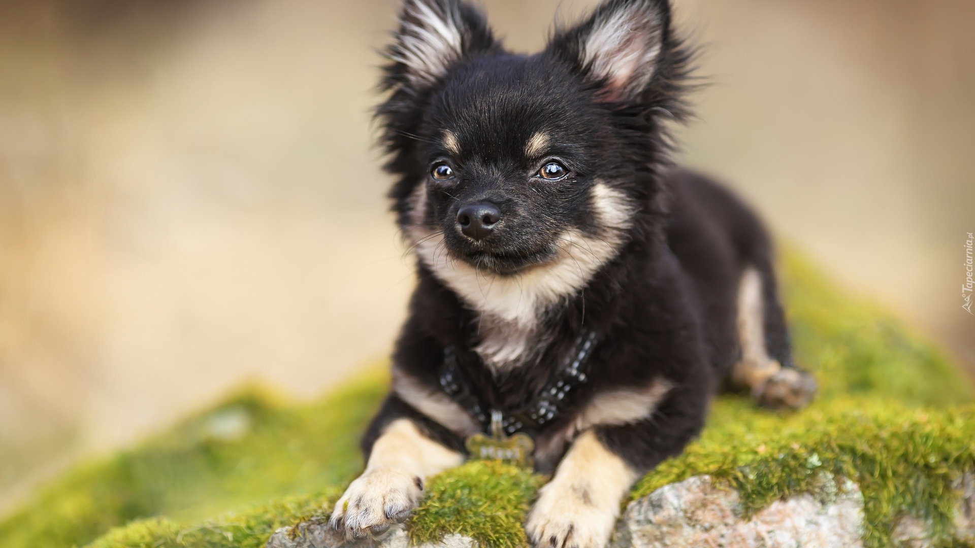 Edytor tapety: Chihuahua na omszonym kamieniu