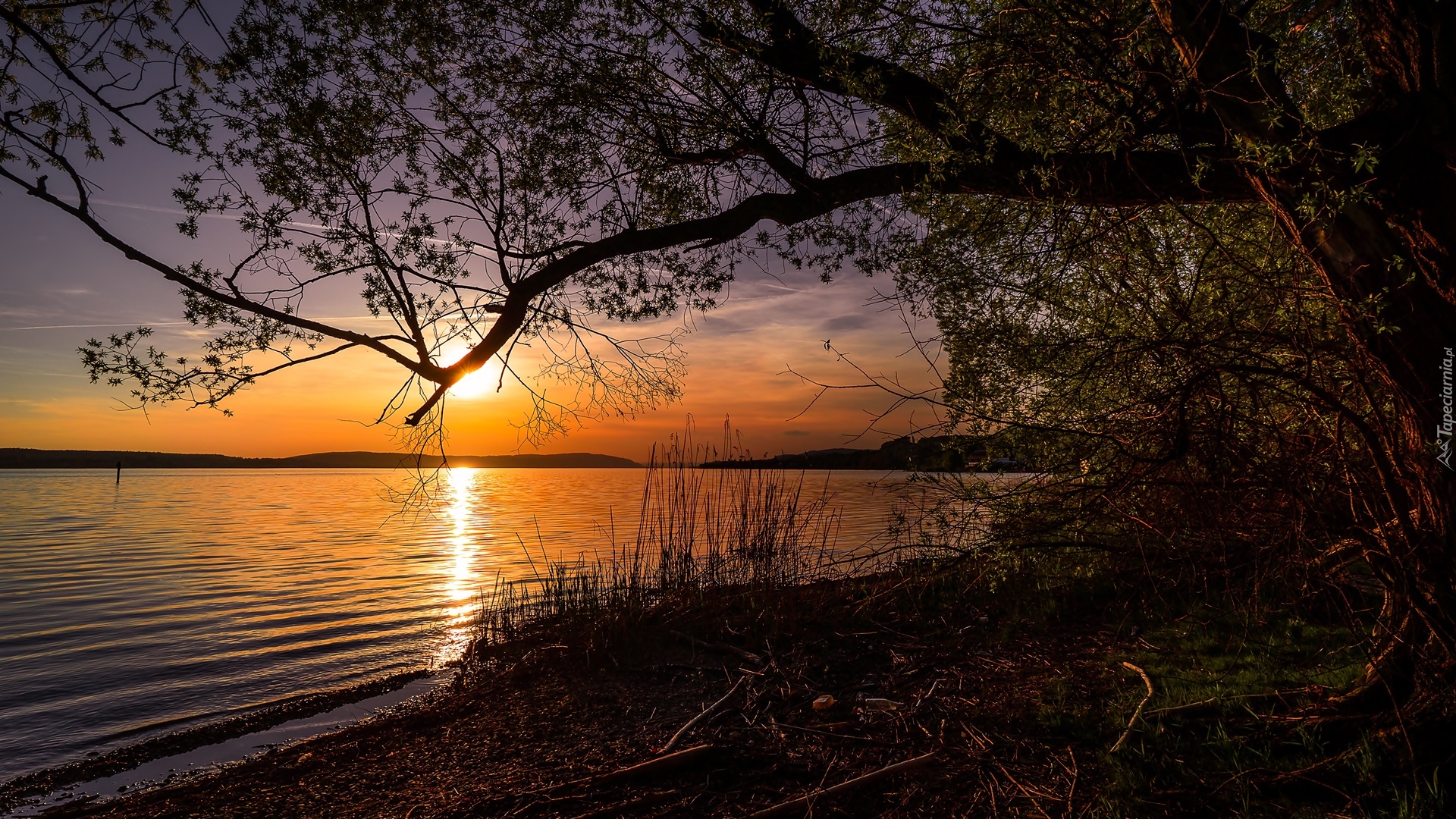 Edytor tapety: Drzewo nad jeziorem w zachodzącym słońcu