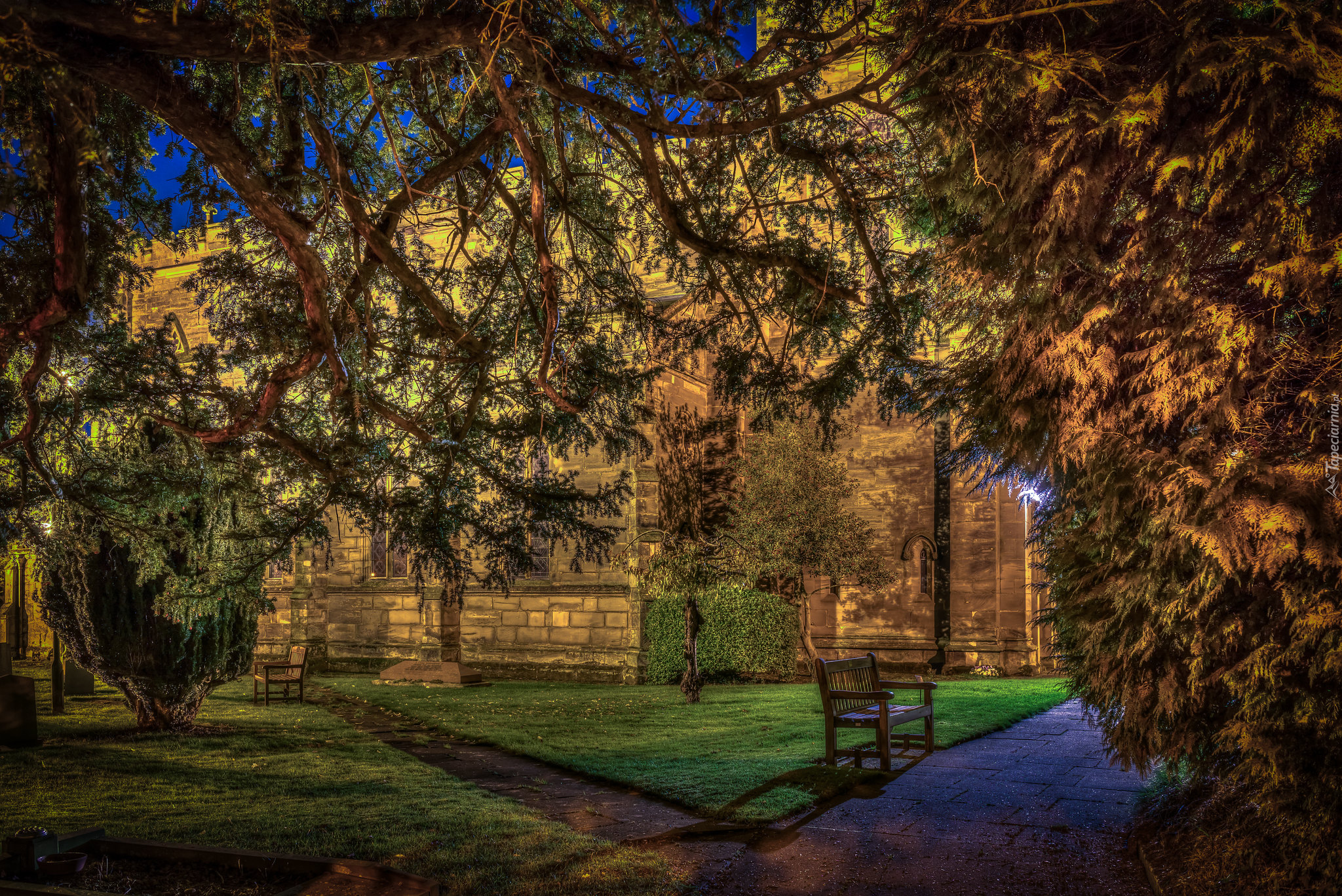 Edytor tapety: Mury kościoła zasłonięte gałęziami drzew