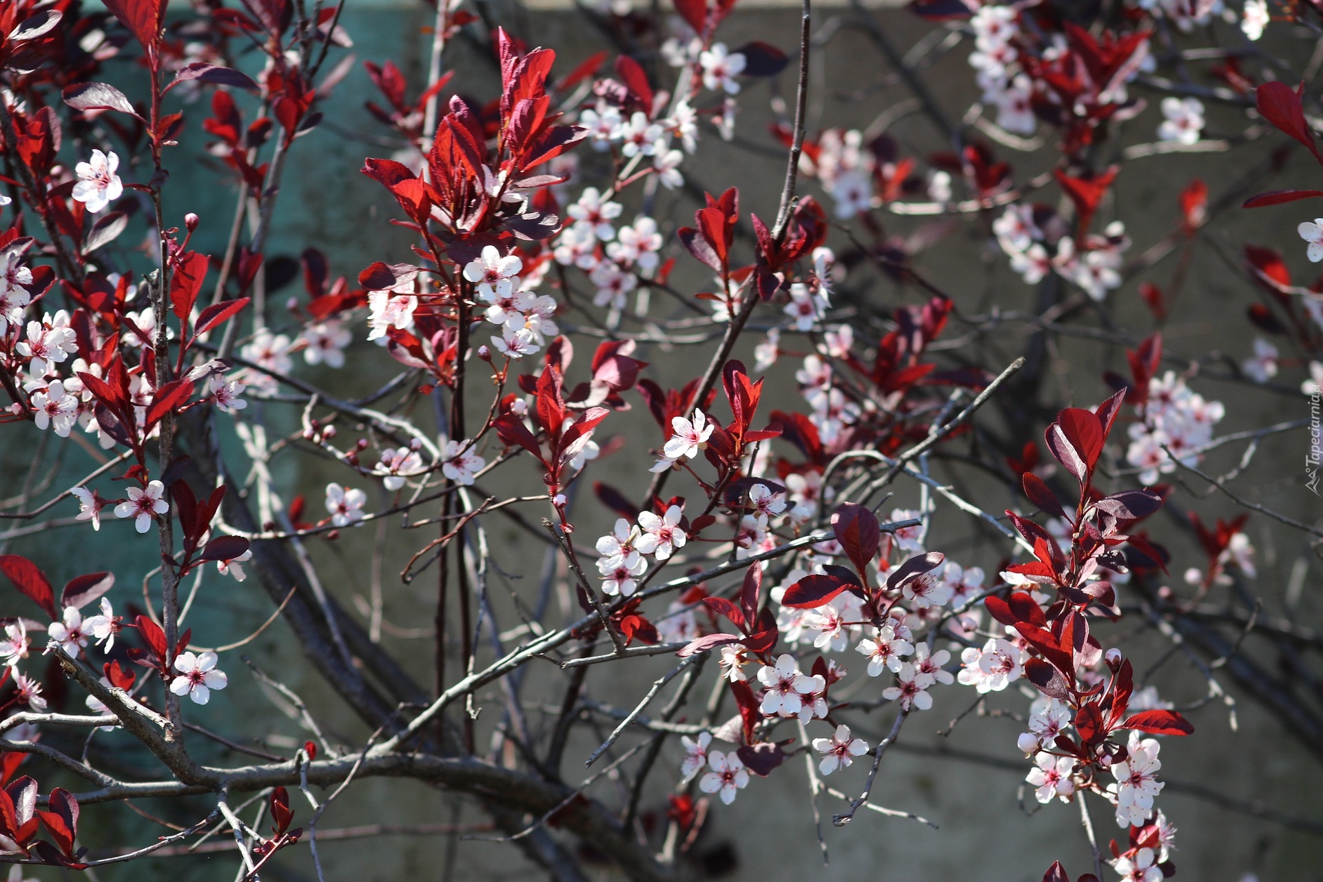 Edytor tapety: Gałązki kwitnącego drzewa owocowego z czerwonymi liśćmi