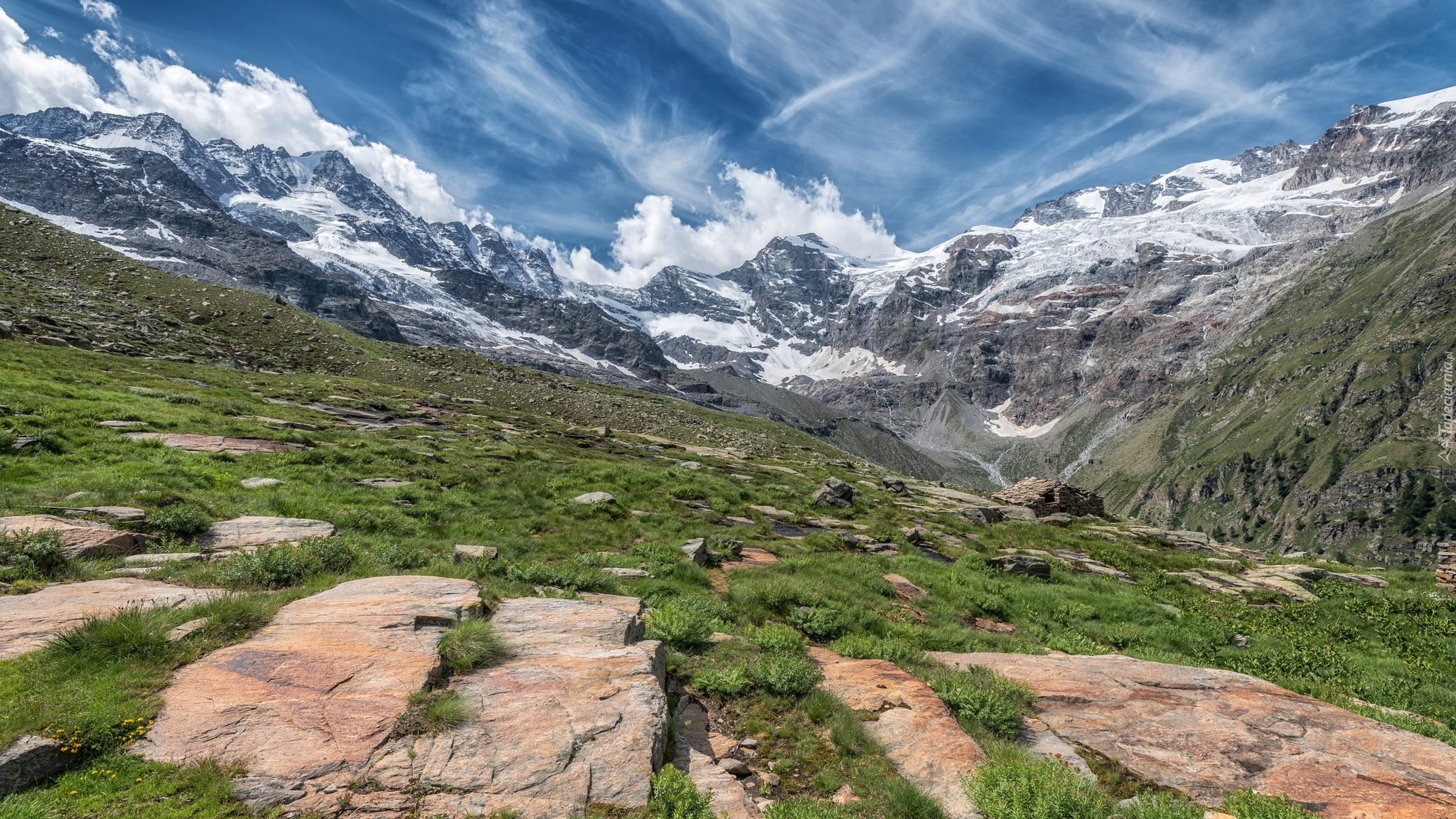 Edytor tapety: Widok z kamienistego wzgórza na ośnieżone szczyty gór