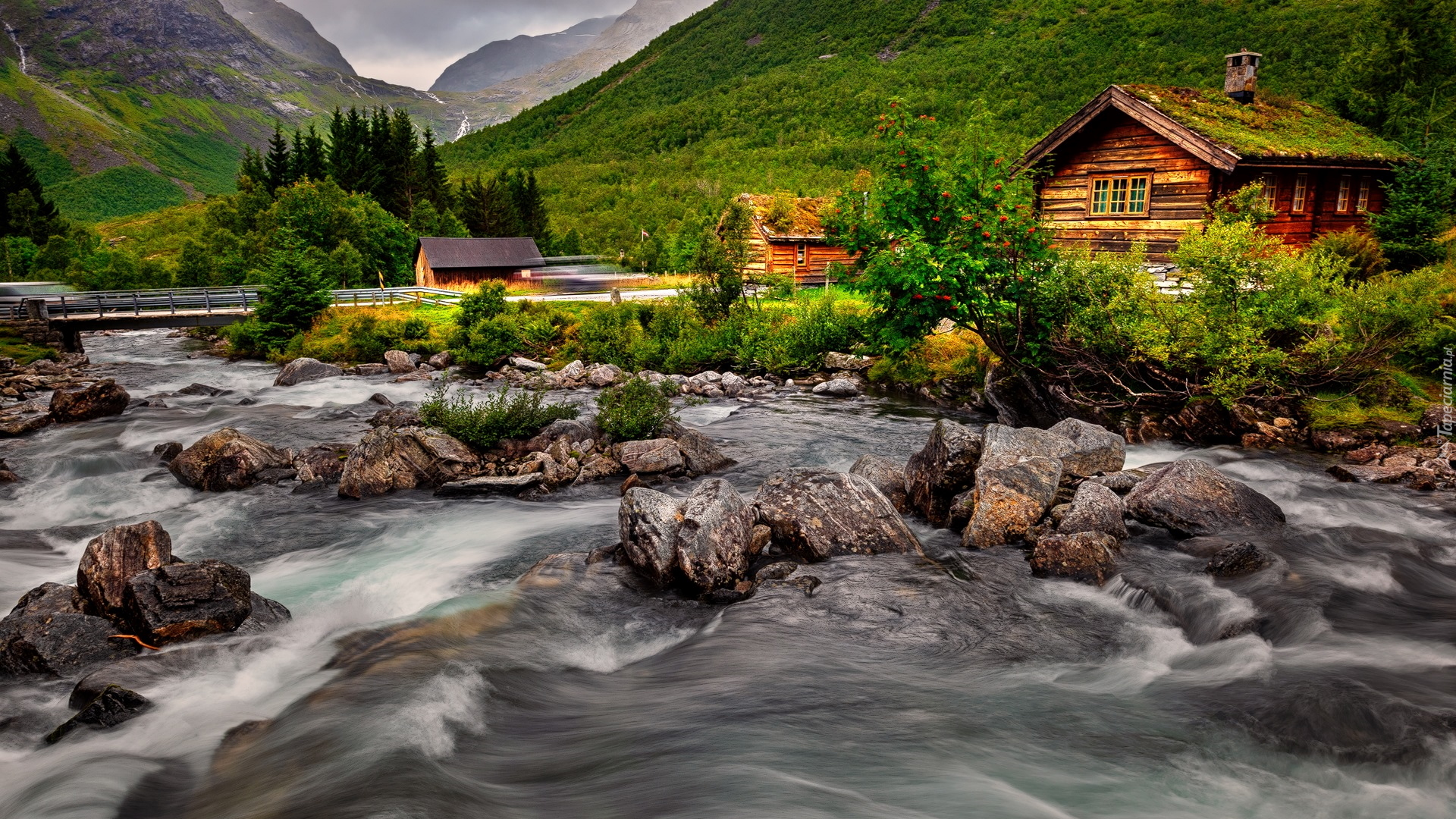 Edytor tapety: Drewniane domy nad rzeką Rauma w Norwegii