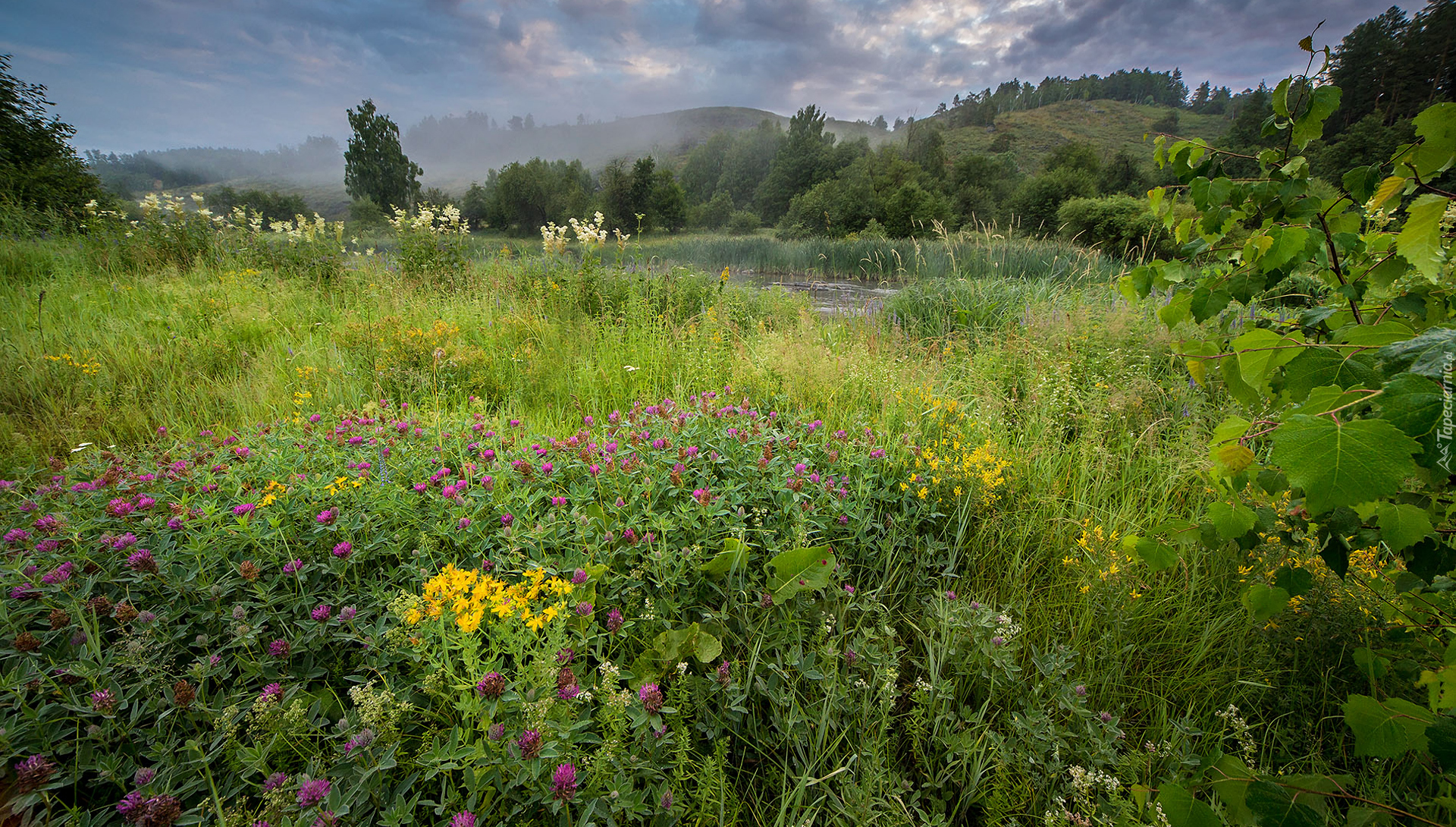 Edytor tapety: Koniczyna i kwiaty na łące nad rzeką