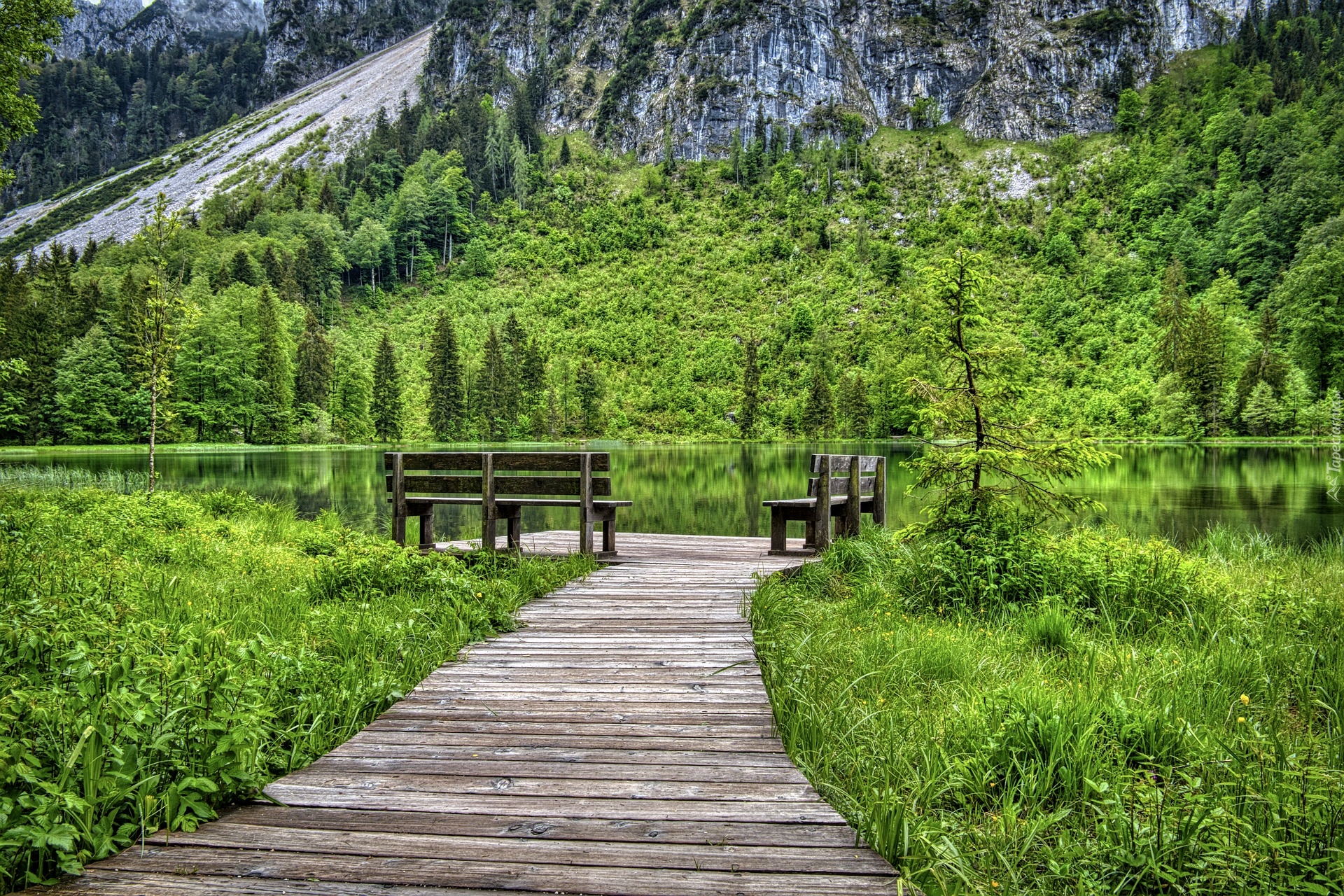 Edytor tapety: Dwie ławki na pomoście nad jeziorem