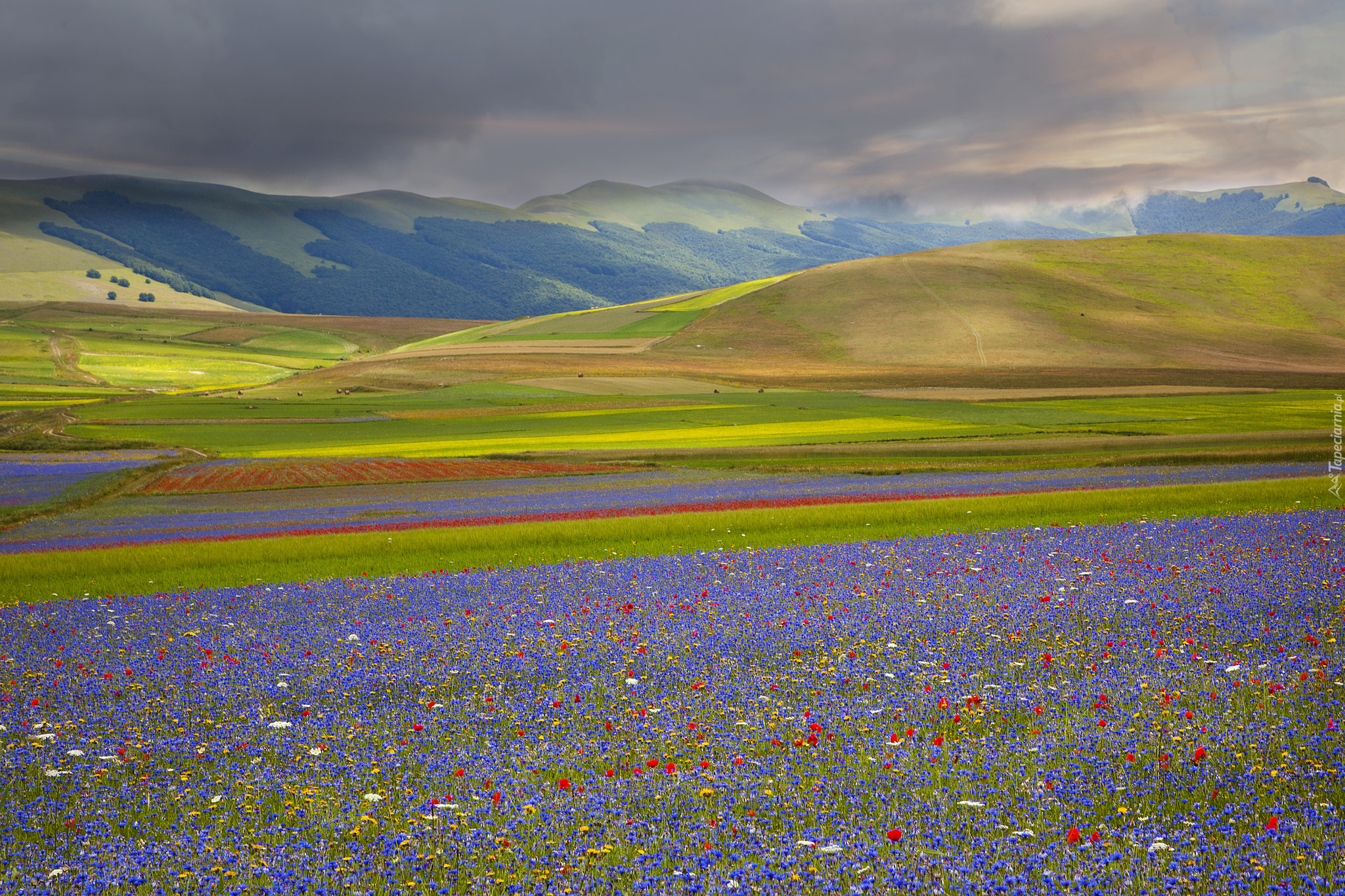 Edytor tapety: Pola i łąki na tle gór