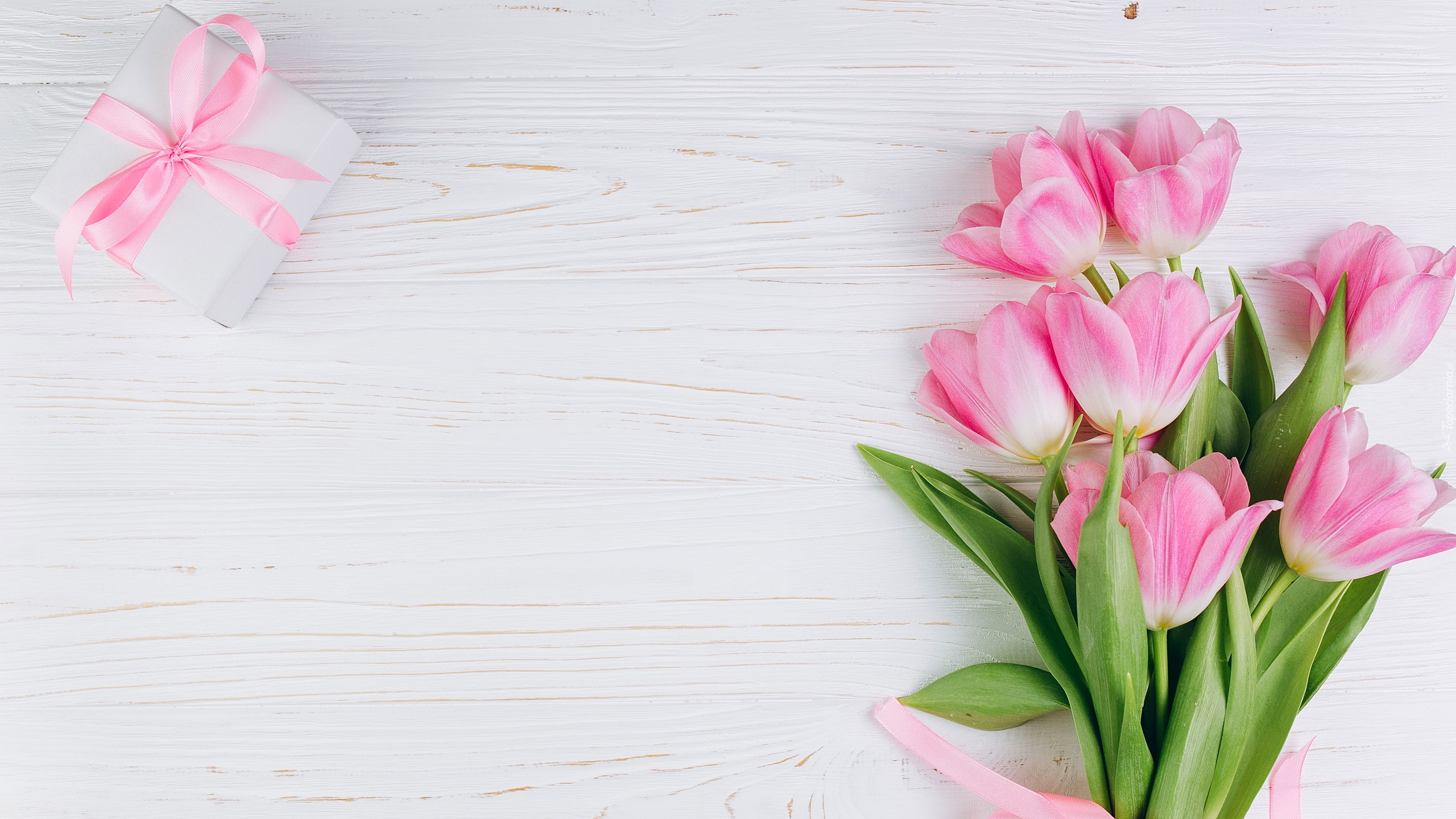 Edytor tapety: Prezent i tulipany na białych deskach