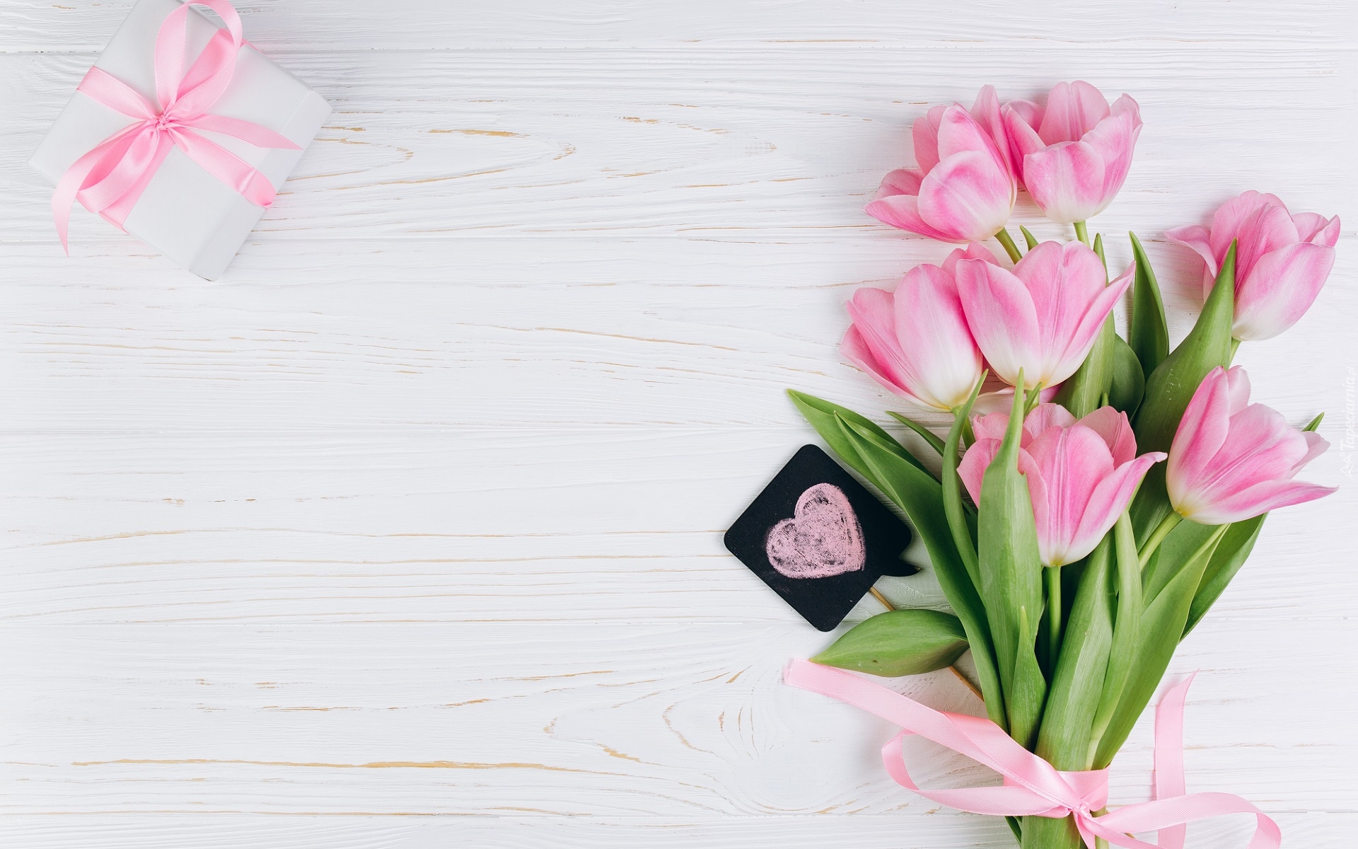 Edytor tapety: Prezent obok różowych tulipanów