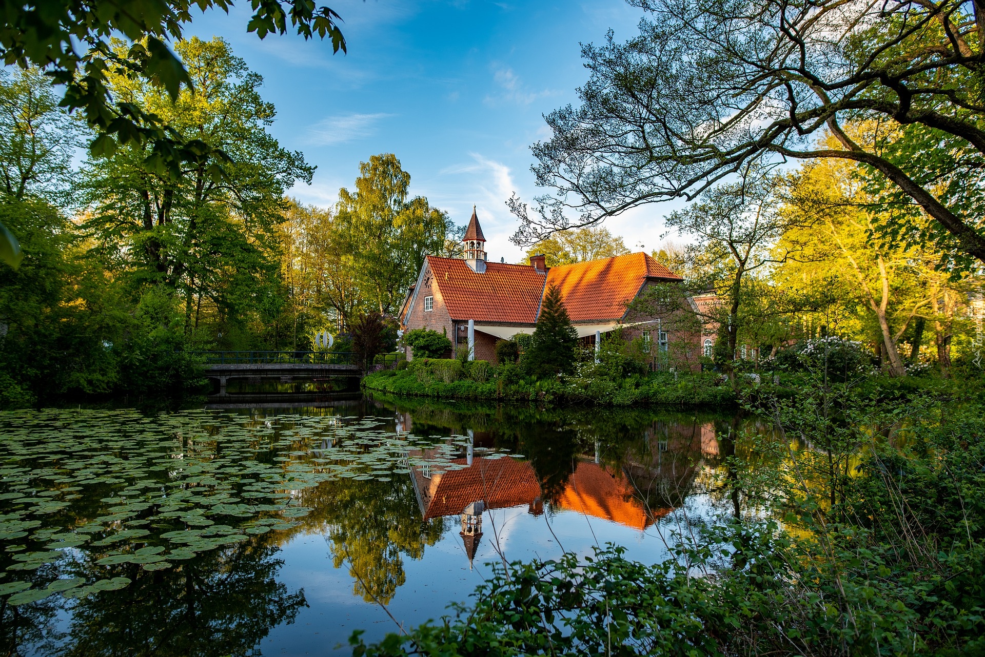 Edytor tapety: Dom nad stawem pośród zielonych drzew
