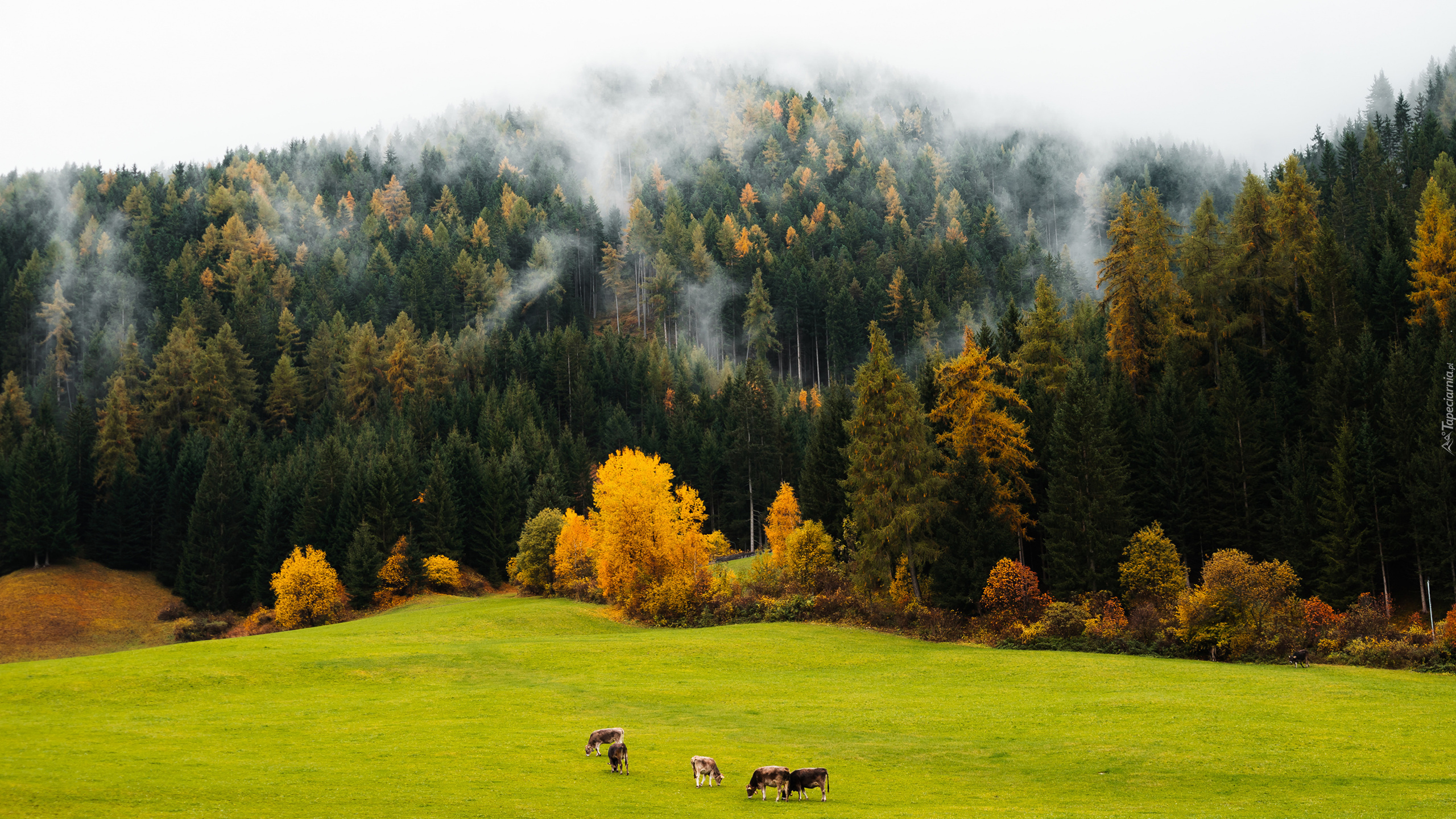 Edytor tapety: Zamglone drzewa i krowy pasące się na łące
