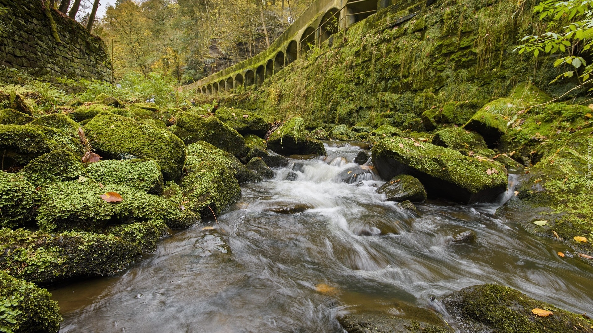 Edytor tapety: Most na omszałych skałach nad rzeką