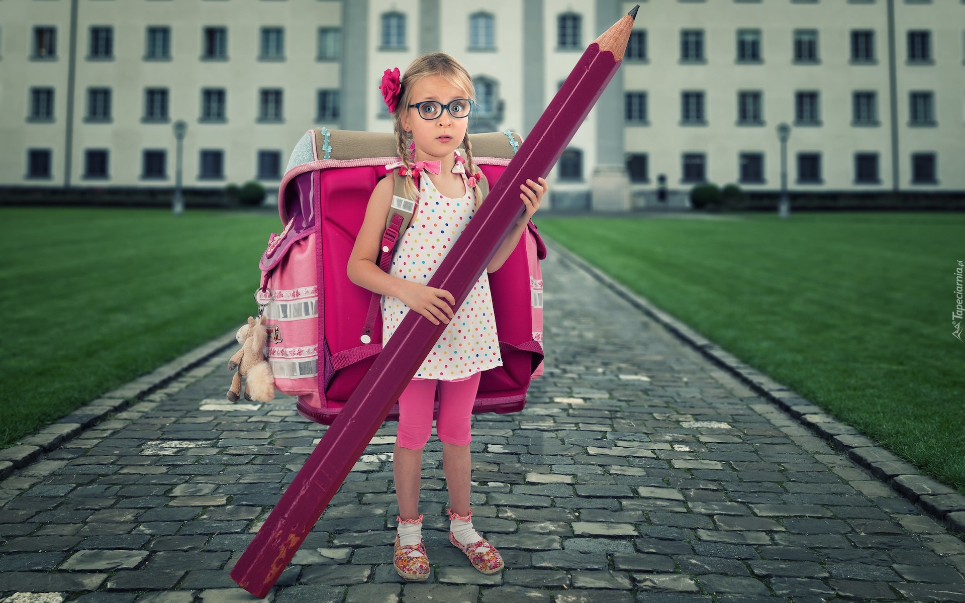 Edytor tapety: Dziewczynka z tornistrem i ołówkiem w ręku