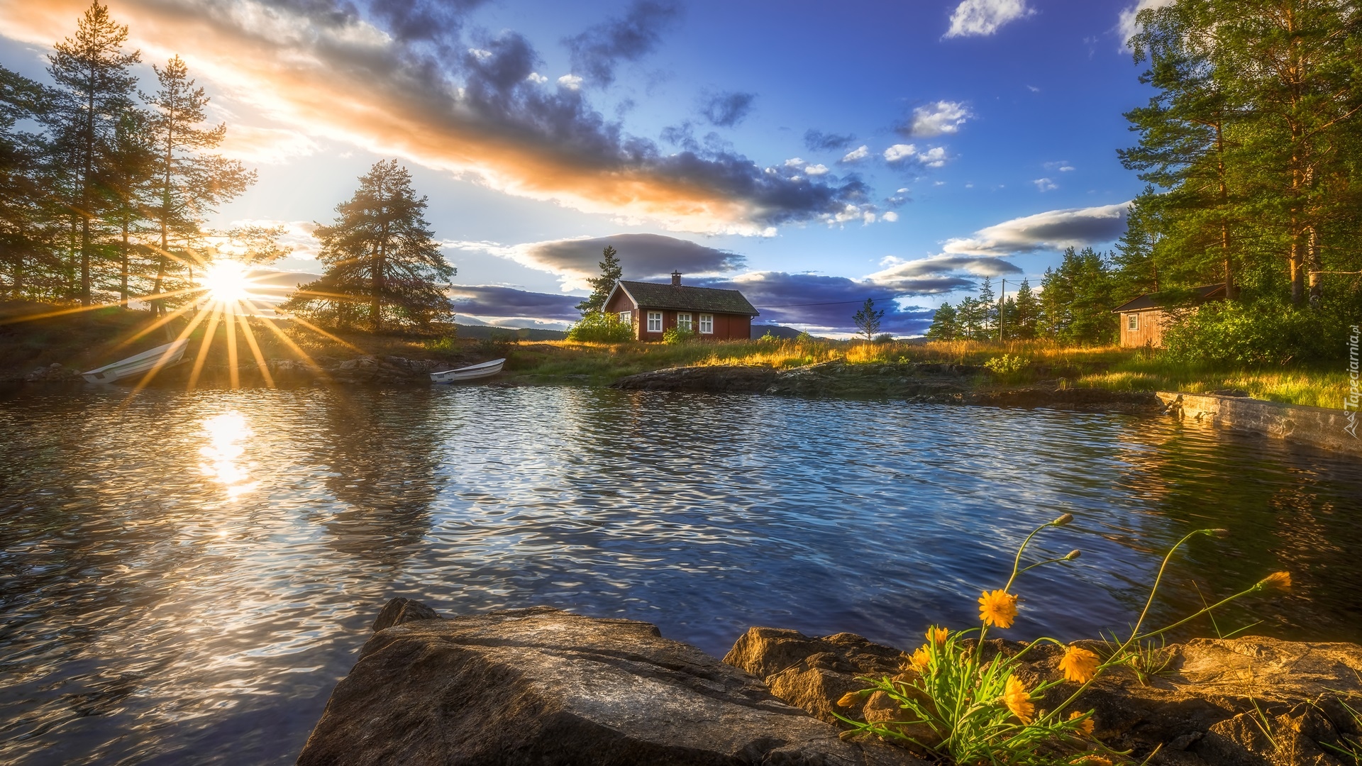 Edytor tapety: Dom i łódki nad brzegiem jeziora Vaeleren