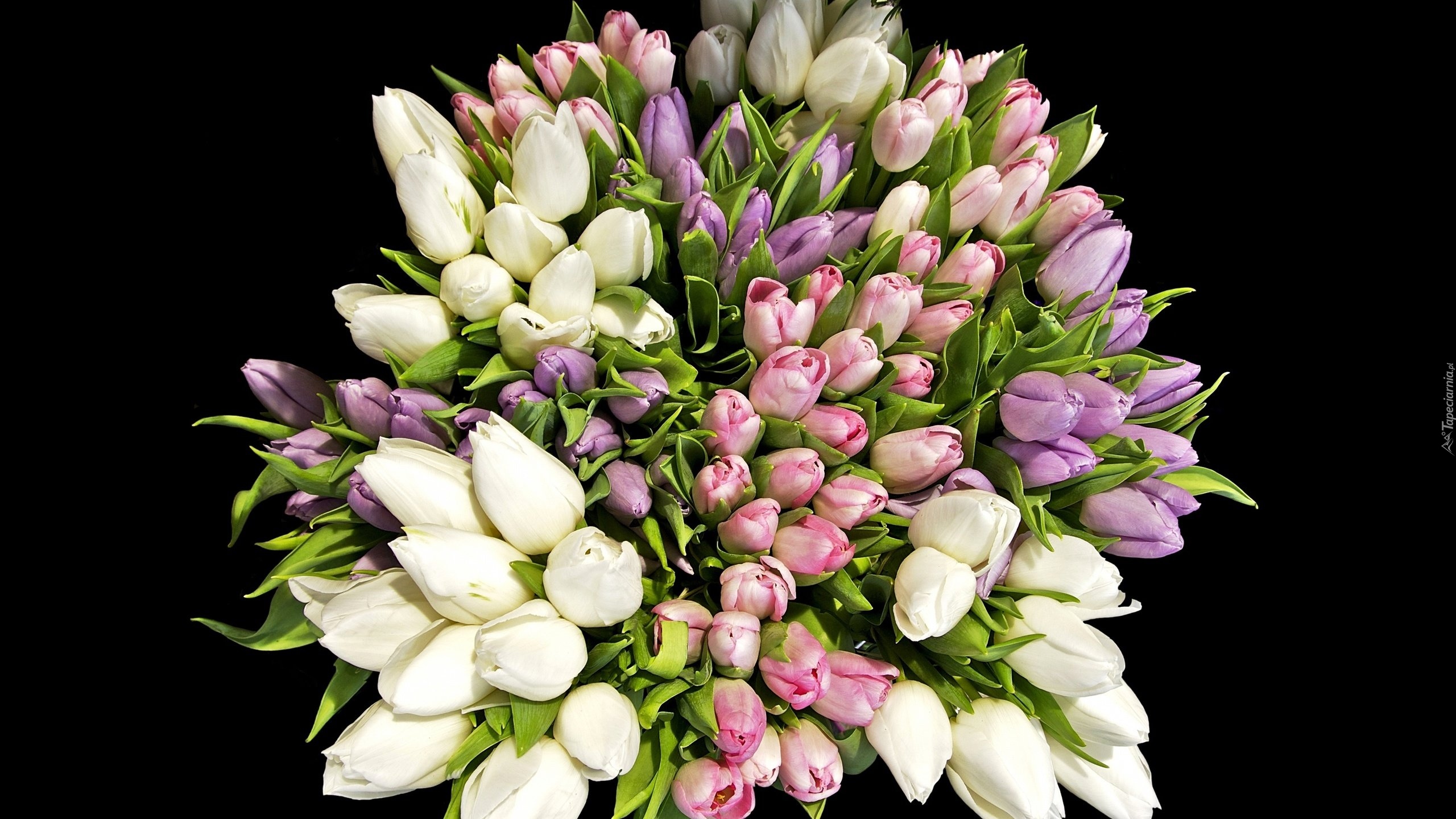 Edytor tapety: Bukiet z kolorowych tulipanów na ciemnym tle