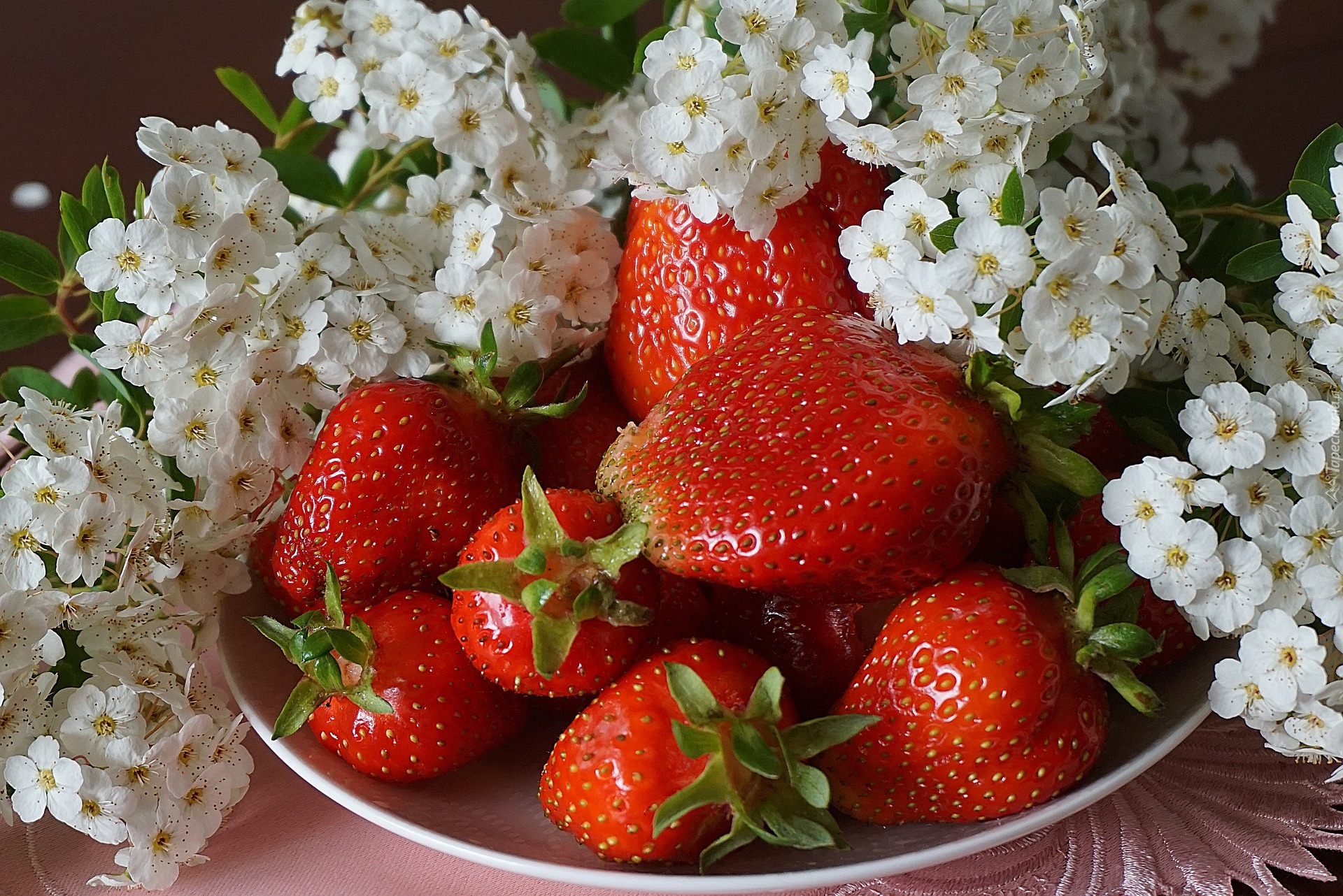 Edytor tapety: Truskawki na talerzyku pośród kwitnących gałązek czeremchy