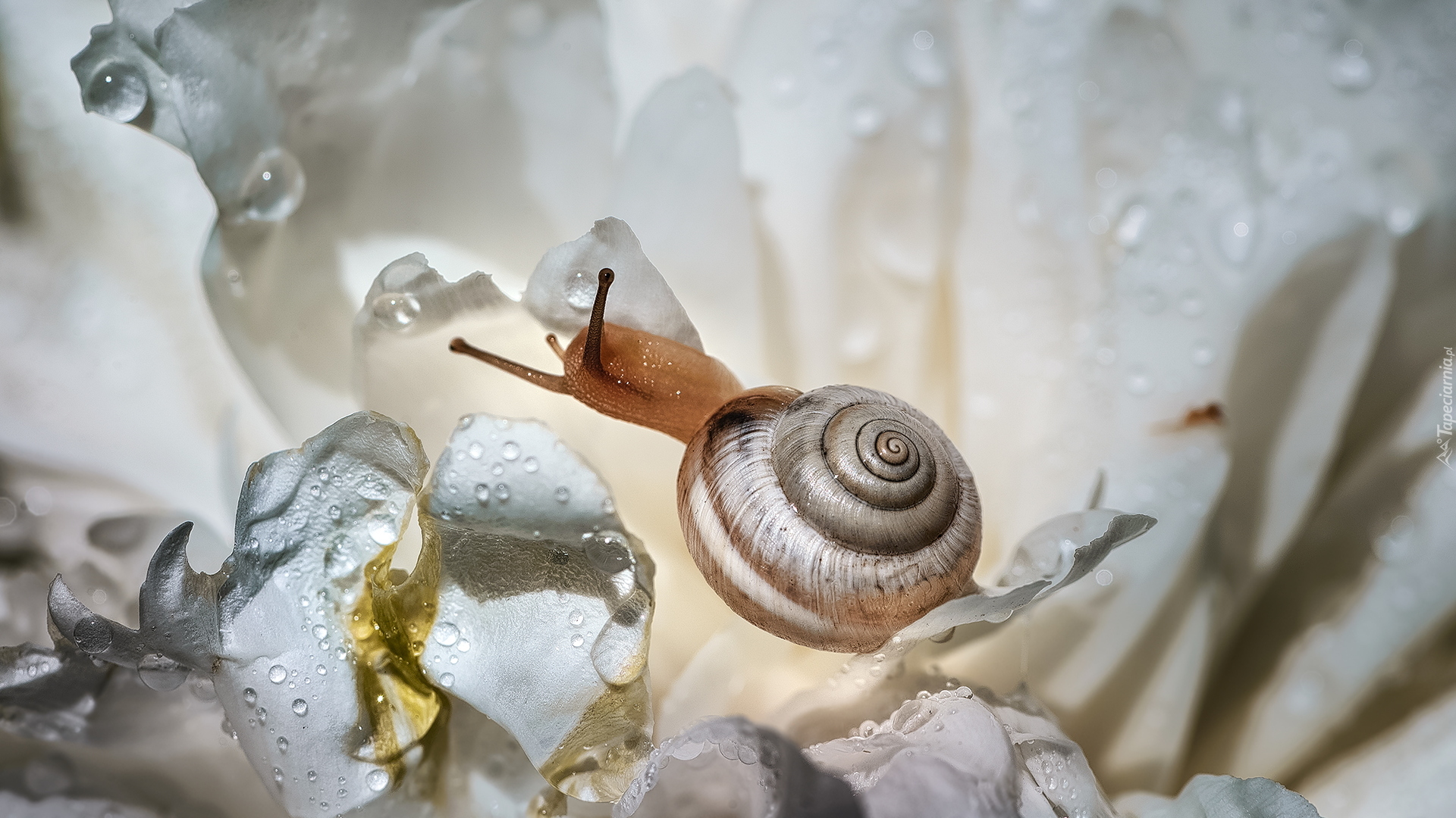 Edytor tapety: Ślimak na zroszonym białym kwiatku