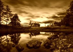 Edytor tapety: Czerwone domki nad jeziorem Vaeleren w Norwegii