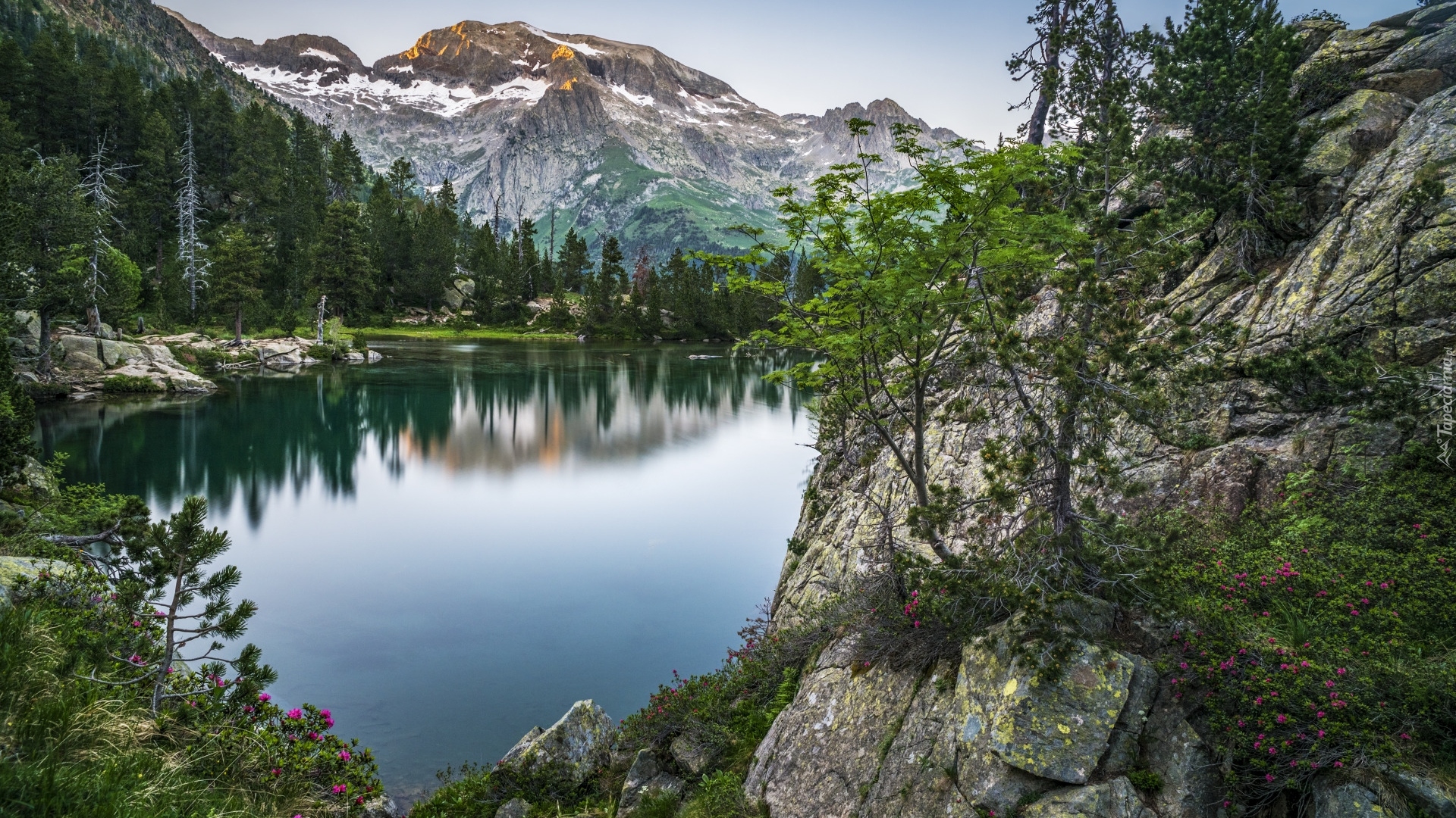 Edytor tapety: Drzewa na skałach nad jeziorem Escarpinosa w Pirenejach