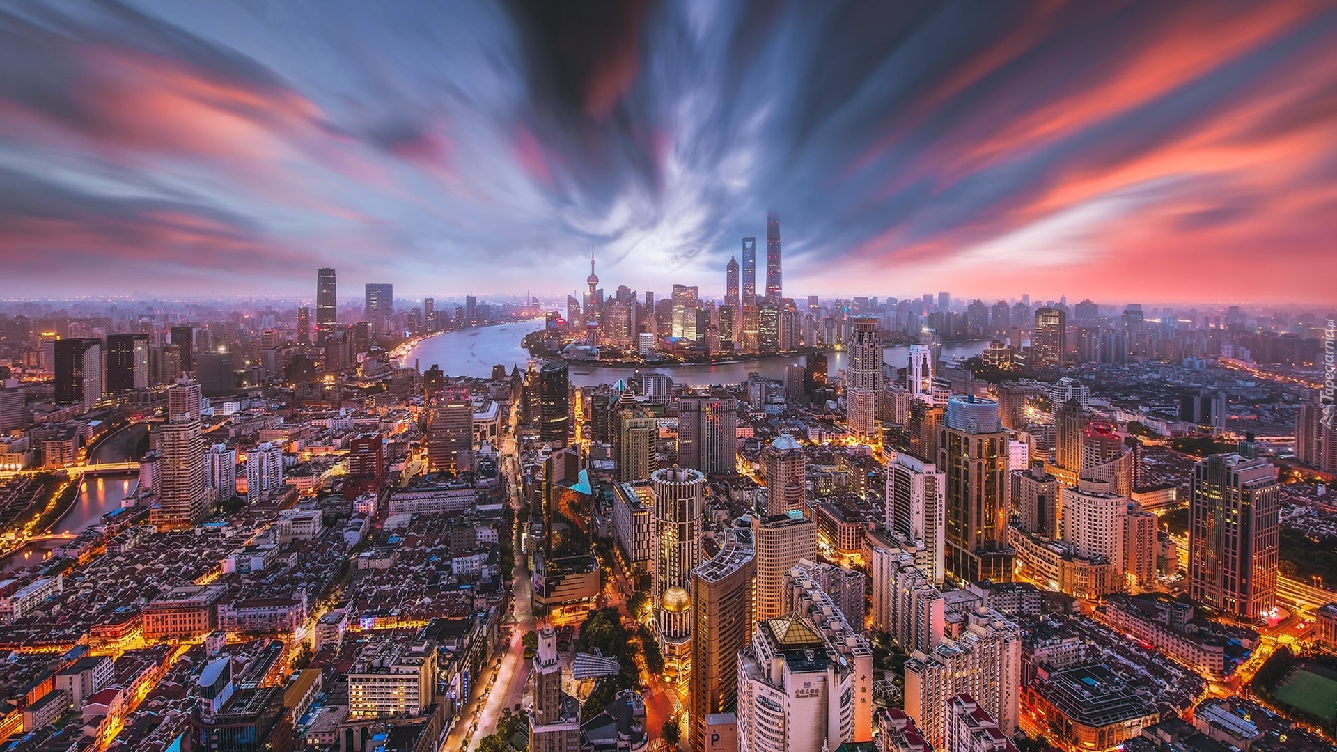 Edytor tapety: Rozświetlone wieżowce i ulice Szanghaju w Chinach