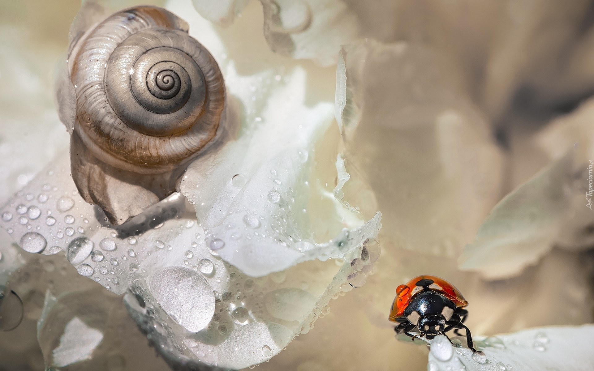 Edytor tapety: Biedronka i ślimak na białym kwiatku