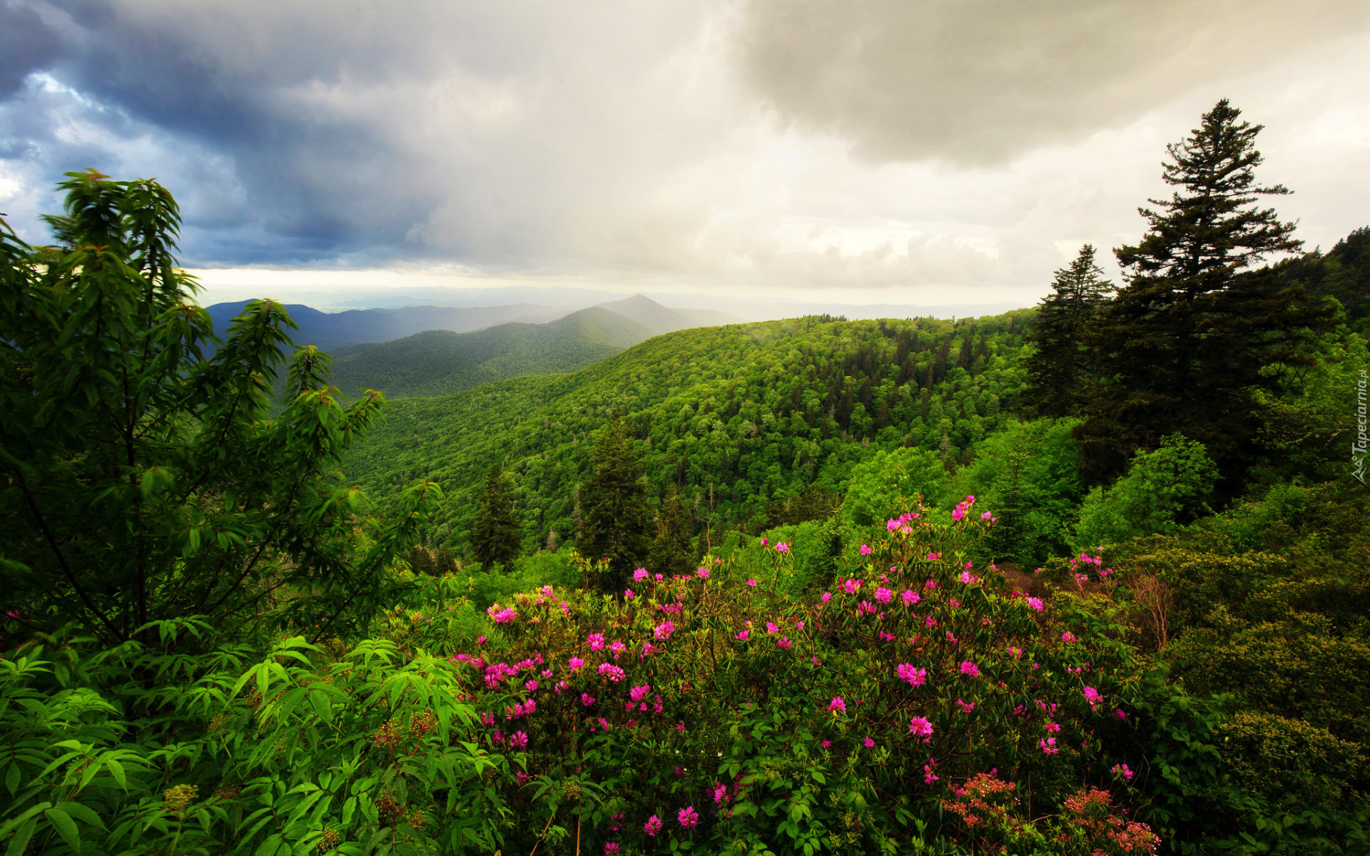 Edytor tapety: Wzgórza porośnięte różowymi kwiatami i roślinnością