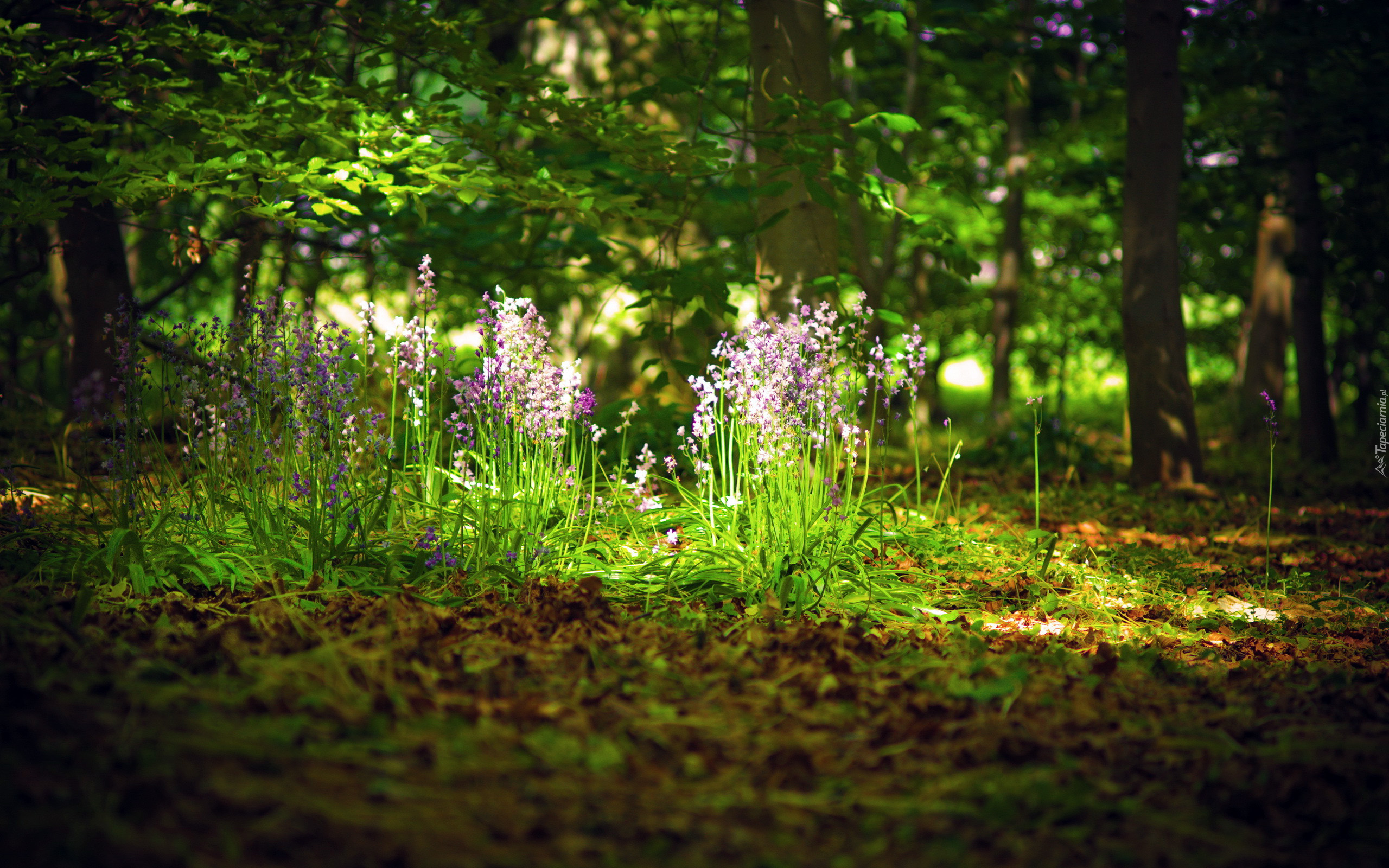Edytor tapety: Fioletowe kwiatki na leśnej polanie w blasku słońca