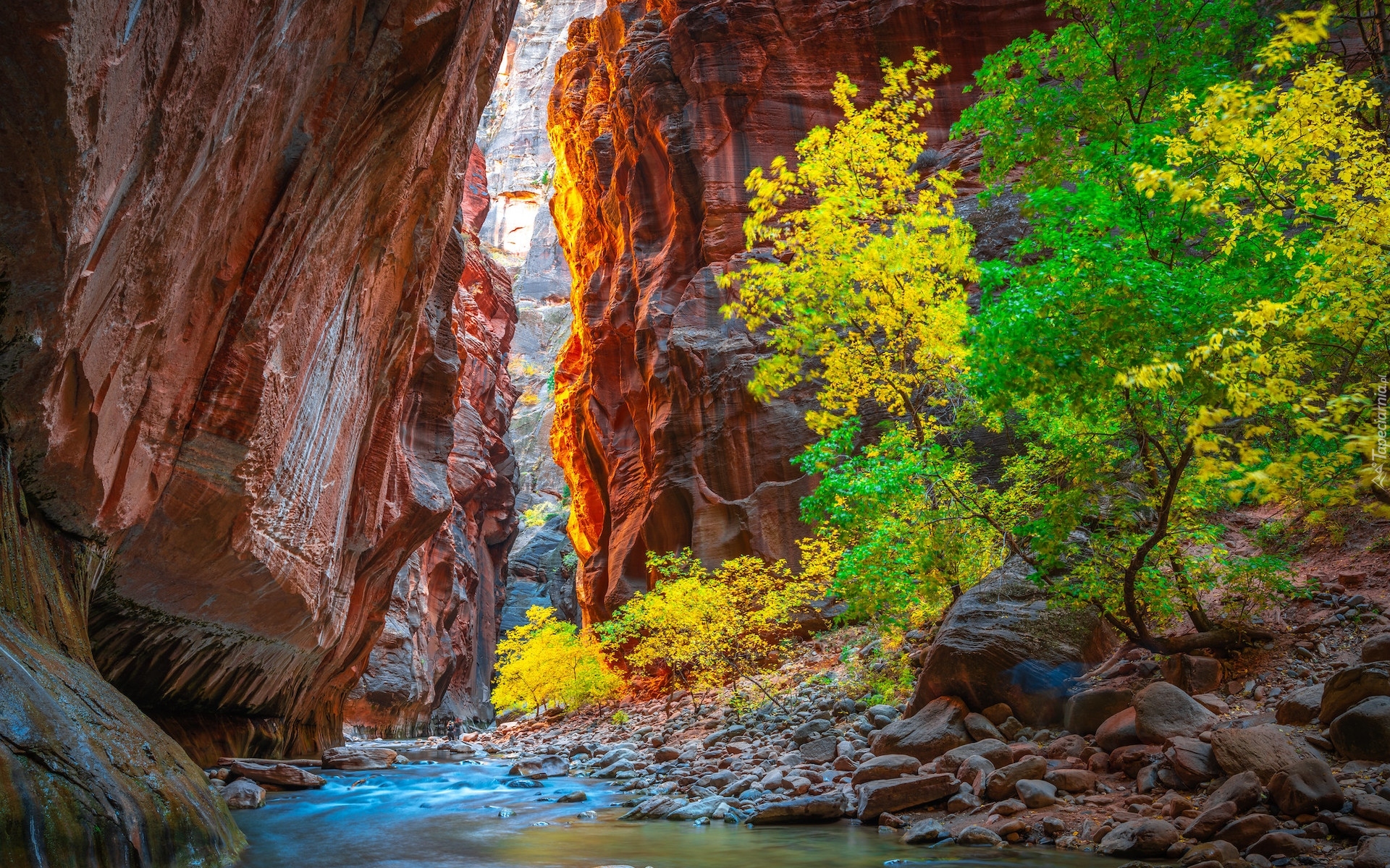 Edytor tapety: Drzewa nad rzeką w kanionie Parku Narodowego Zion
