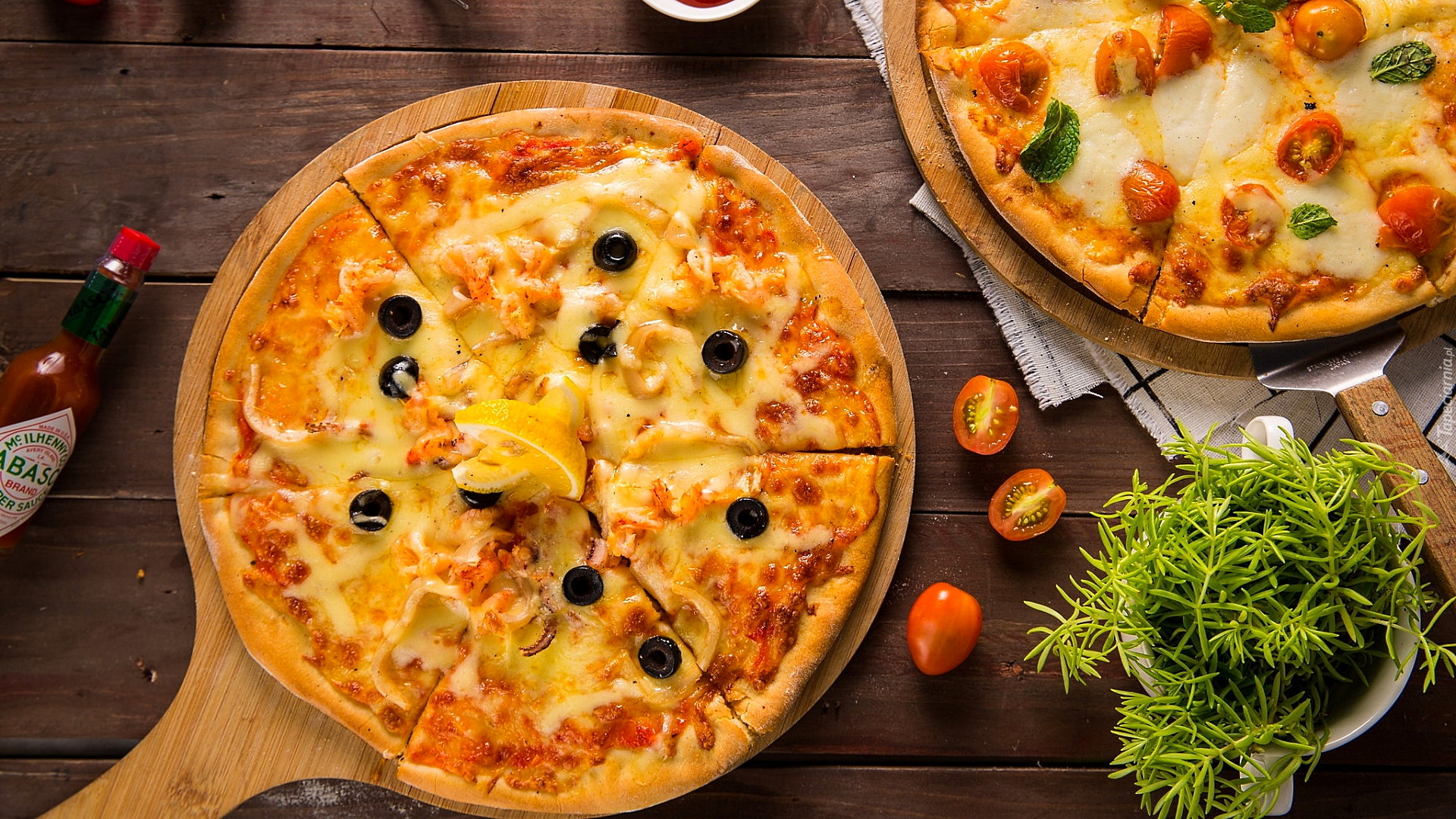 Edytor tapety: Pizza obok ziół i sosu tabasco