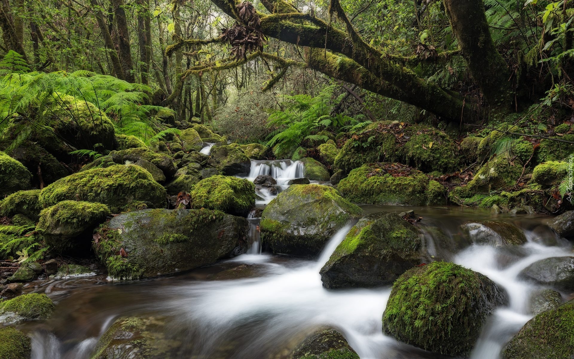 Edytor tapety: Drzewa i paprocie przy leśnym strumyku