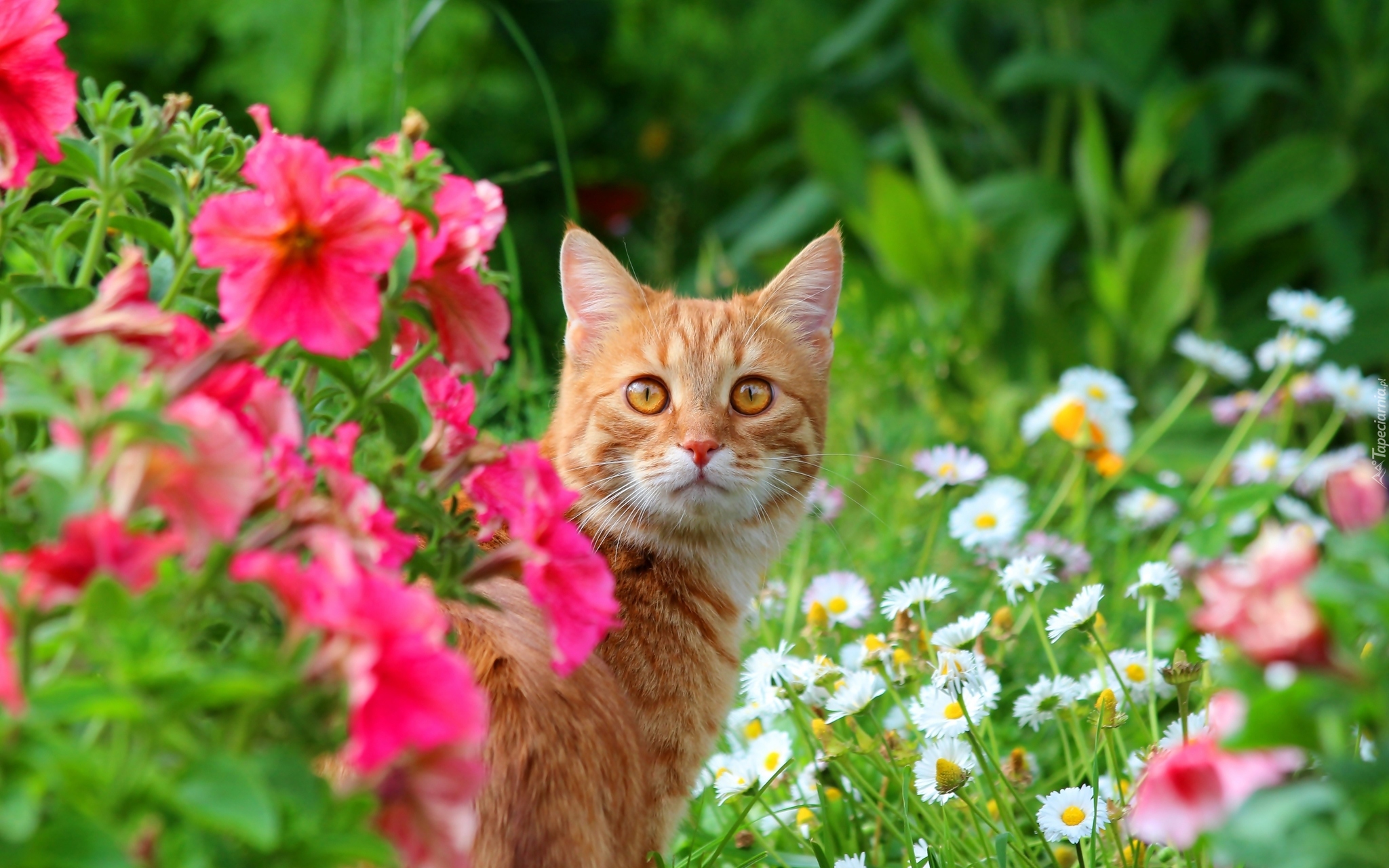 Edytor tapety: Rudy kot wśród kwiatów