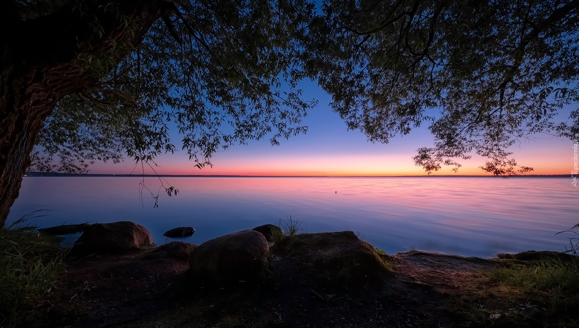 Edytor tapety: Widok na zachodzące słońce nad jeziorem