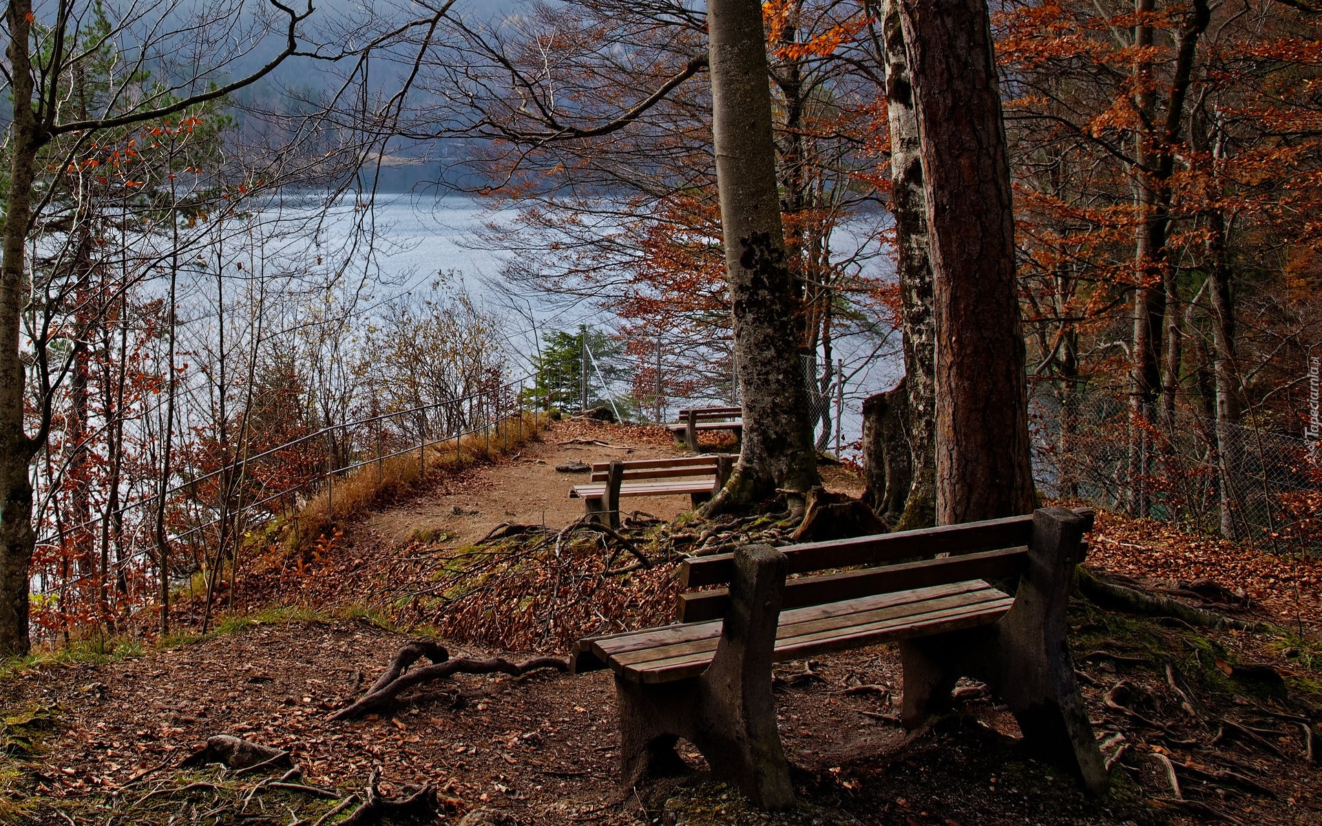 Edytor tapety: Ławki pod jesiennymi drzewami nad jeziorem