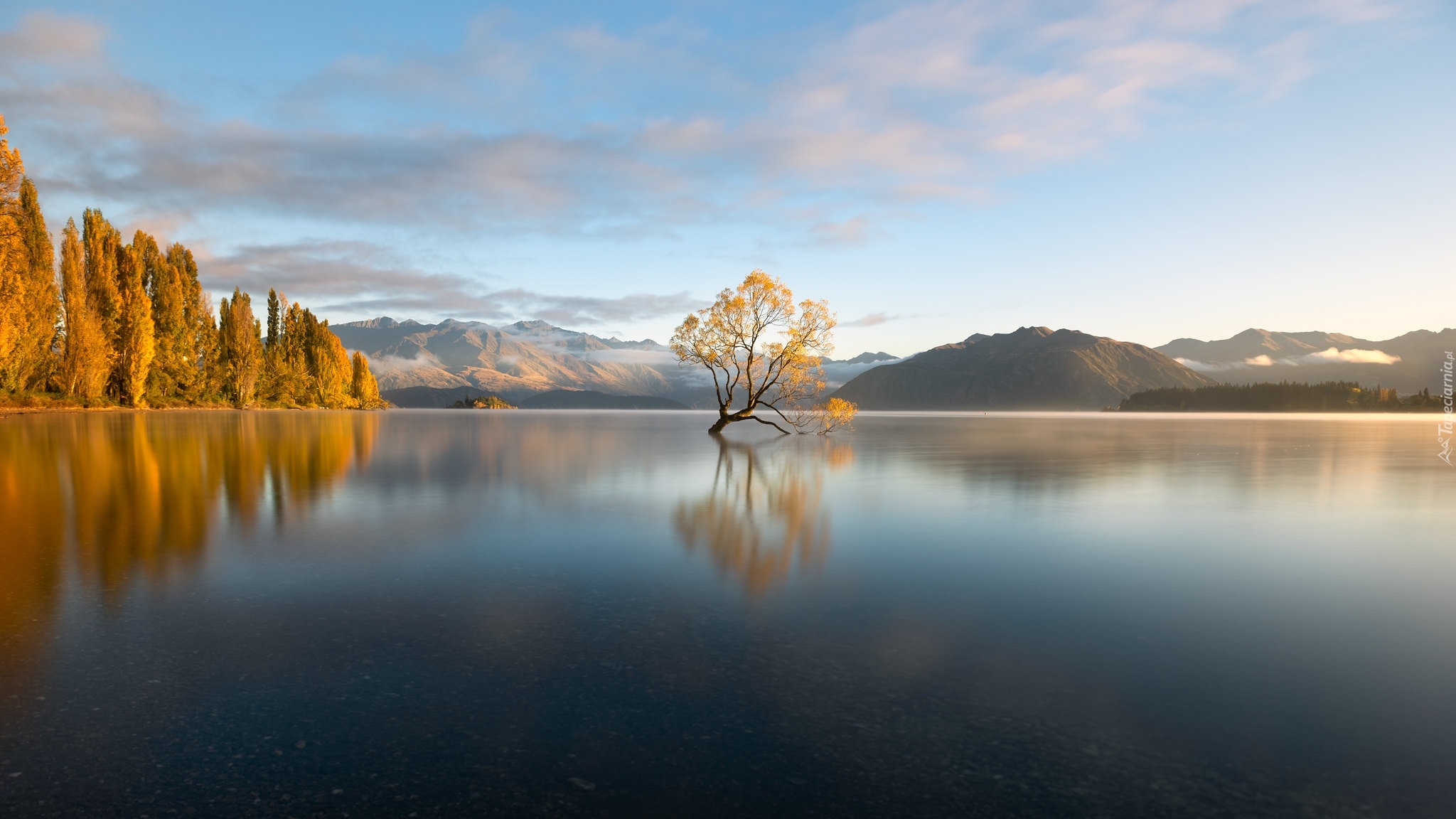 Edytor tapety: Jesienne drzewa na jeziorze Wanaka w Nowej Zelandii