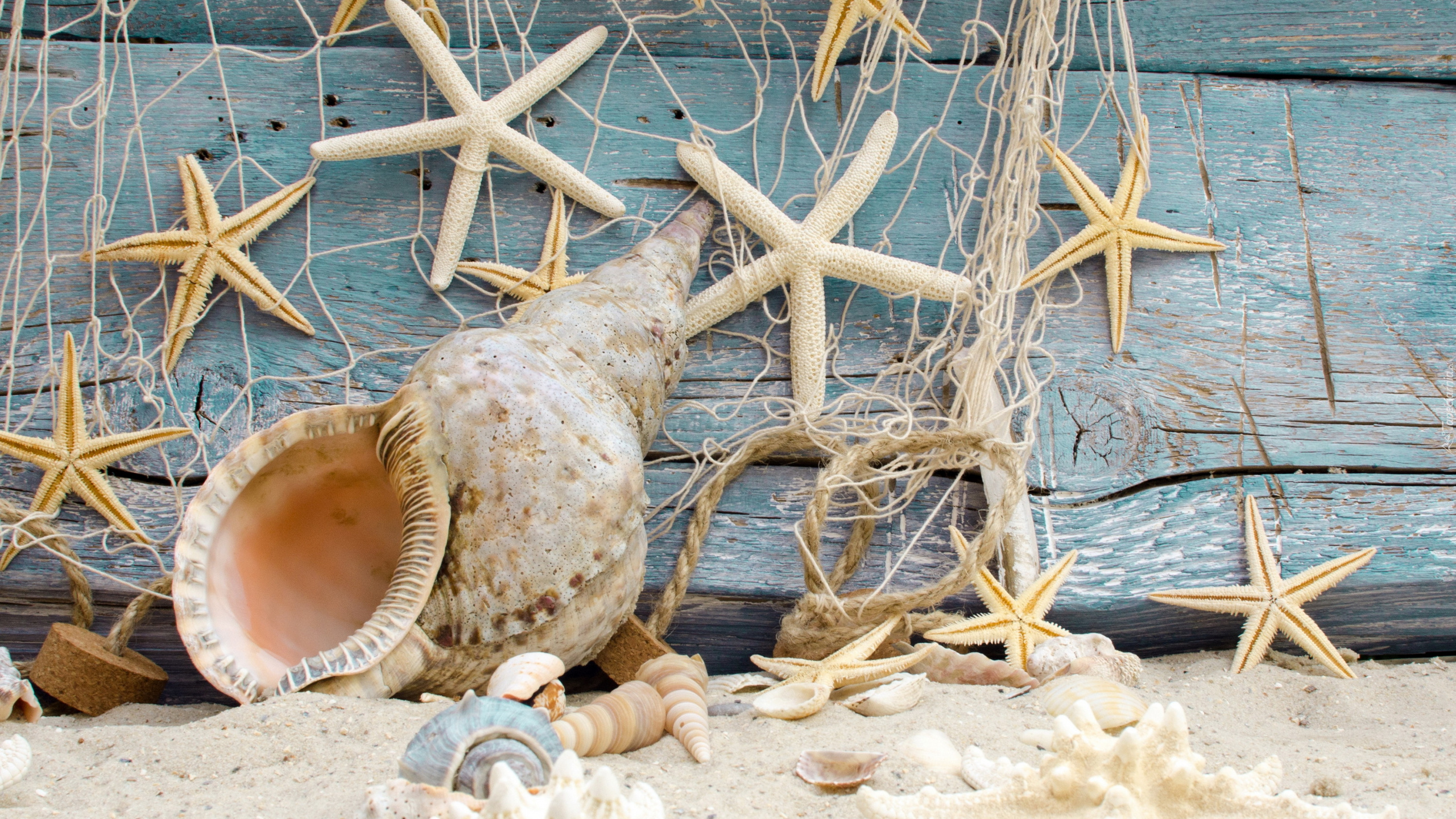 Edytor tapety: Muszla obok rozgwiazd wiszących na siatce