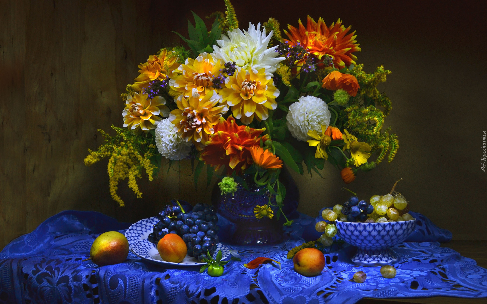 Edytor tapety: Winogrona obok dalii w niebieskim wazonie