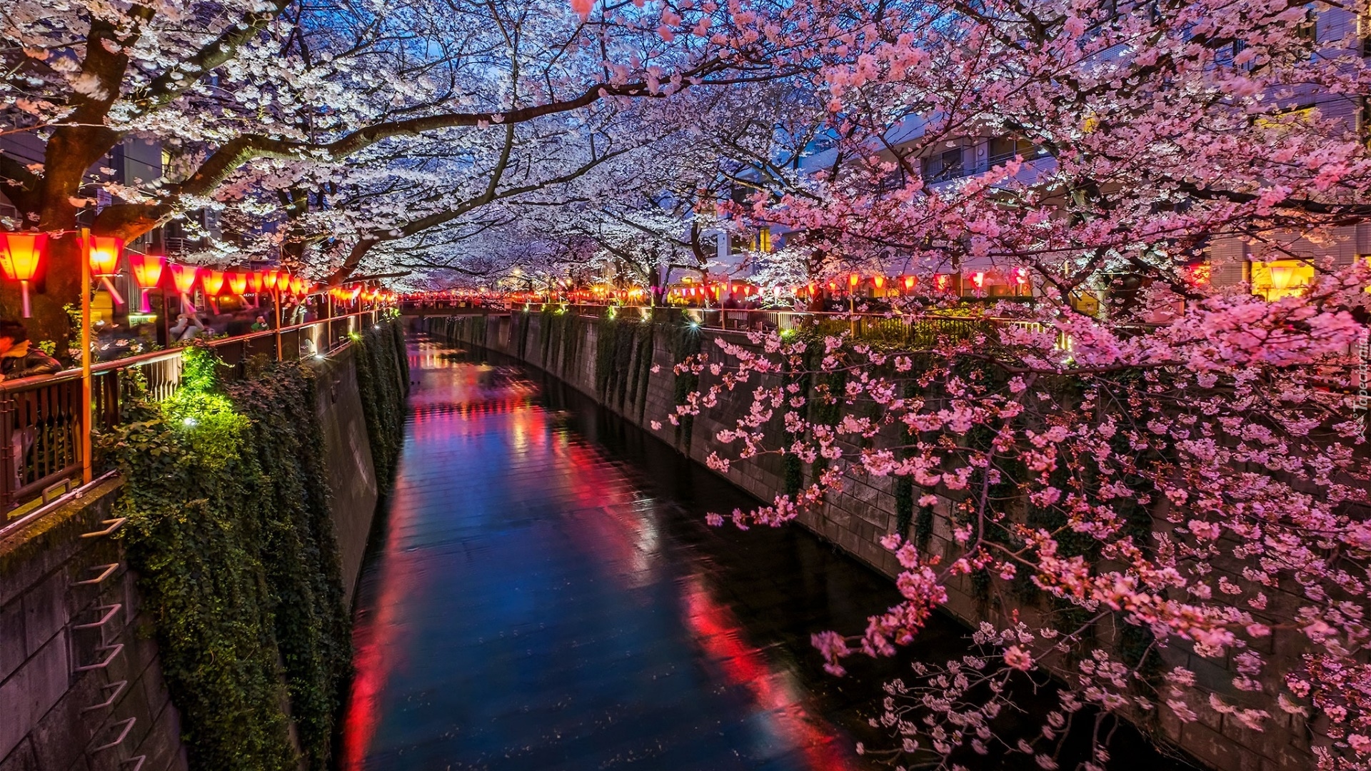 Edytor tapety: Kwitnące drzewa nad kanałem w Tokio