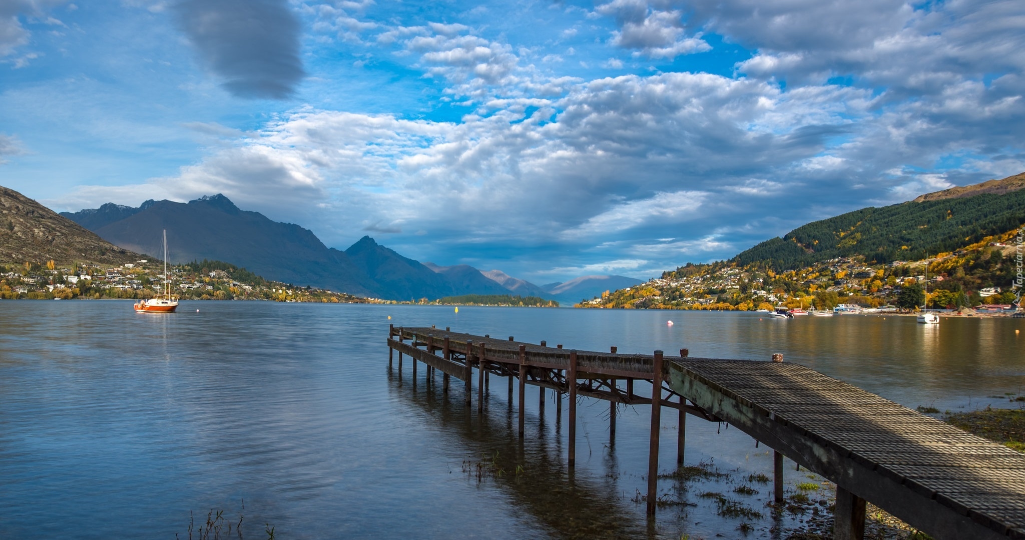 Edytor tapety: Żaglówka na jeziorze w pobliżu pomostu