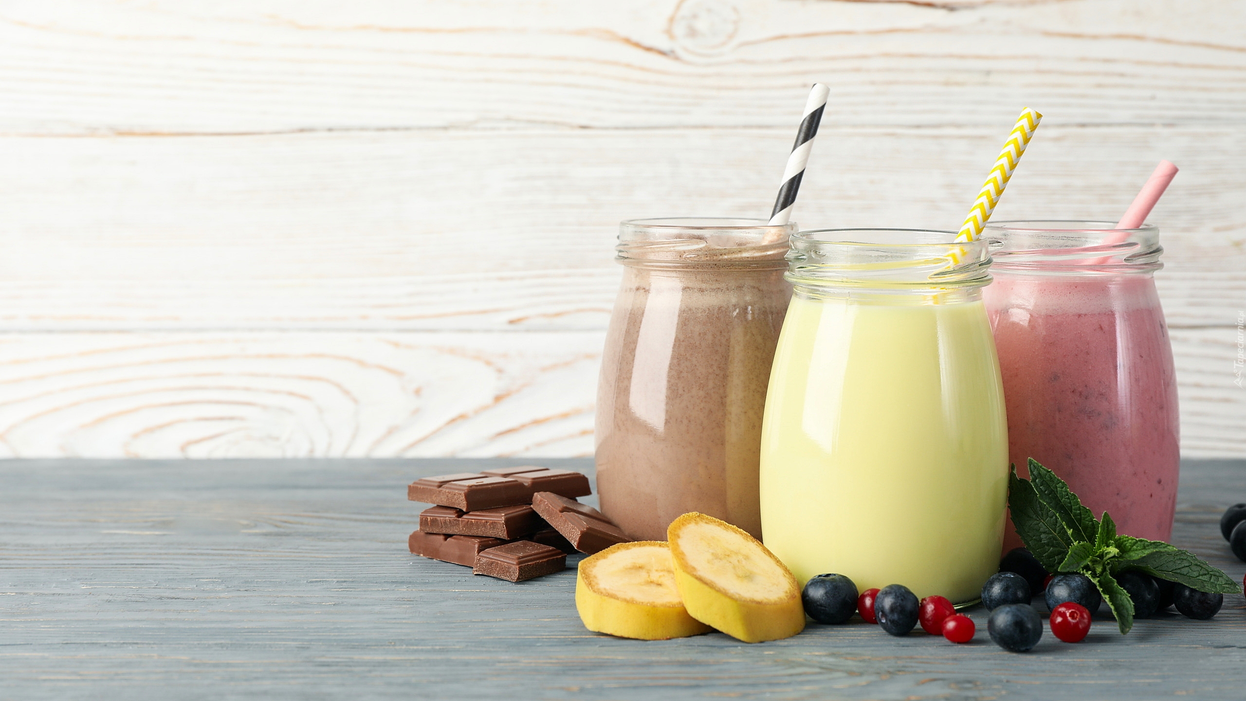 Edytor tapety: Owocowe koktajle ze słomką na deskach