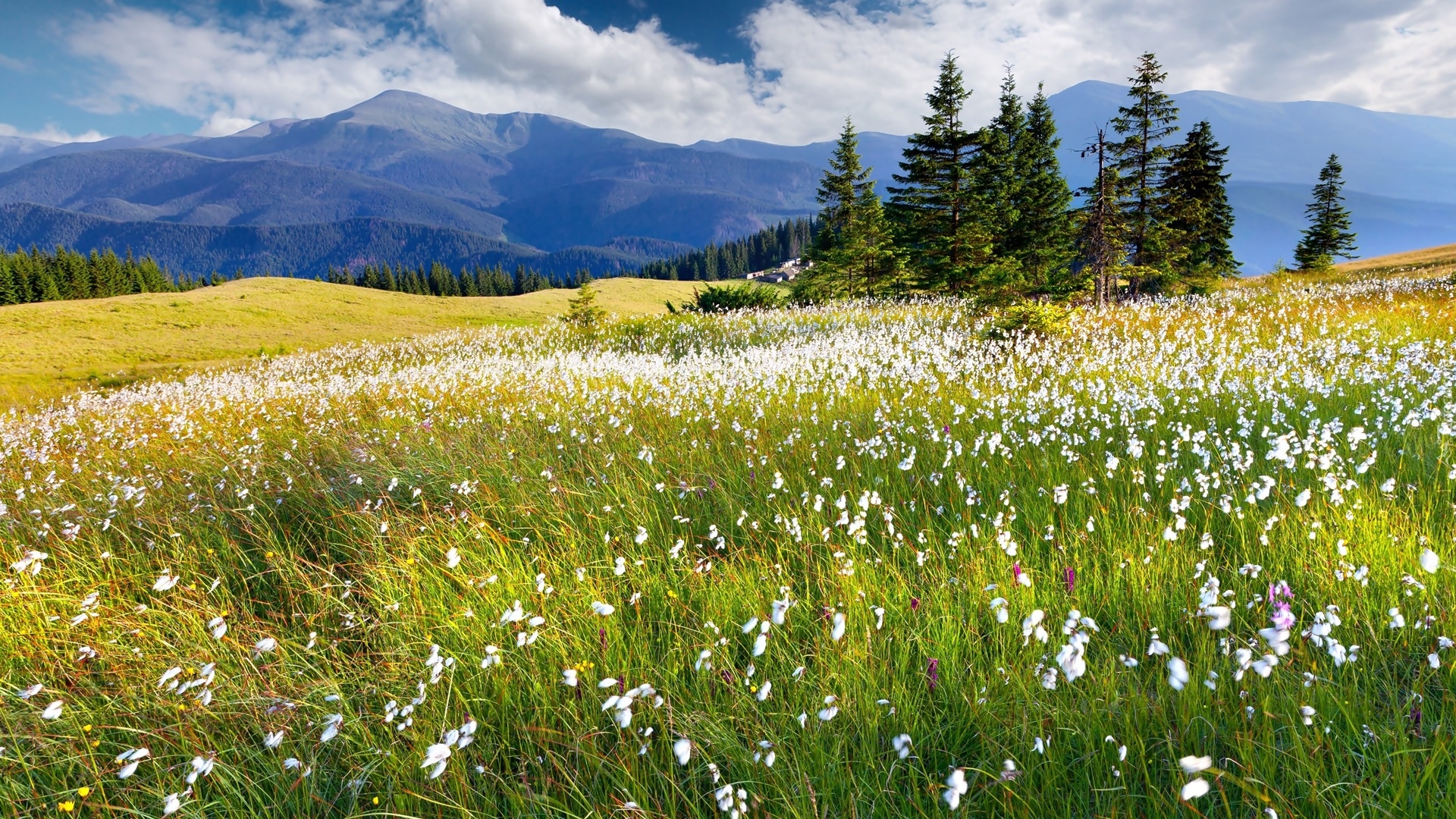 Edytor tapety: Drzewa na łące i góry w tle