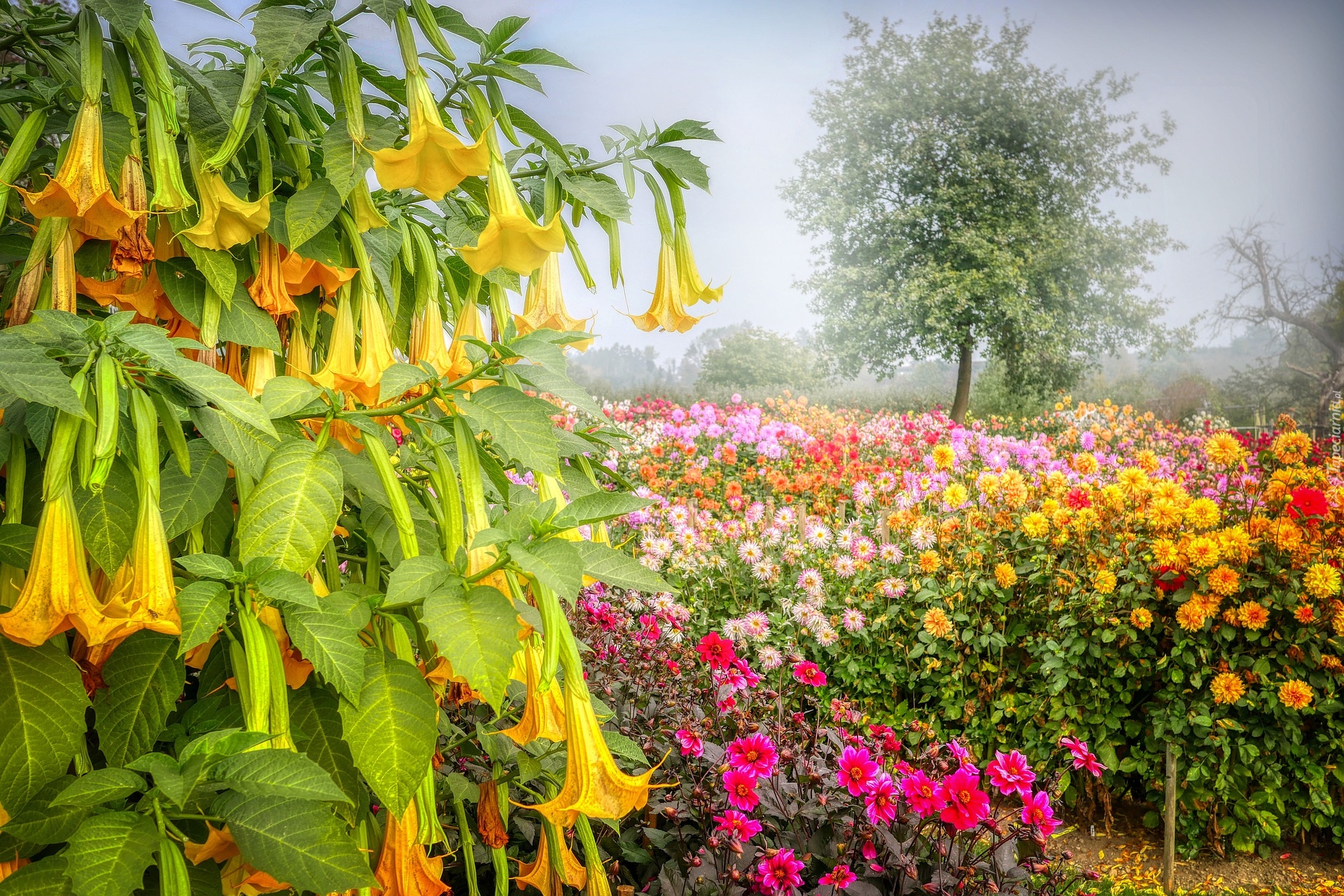 Edytor tapety: Brugmansja i dalie w słonecznym blasku