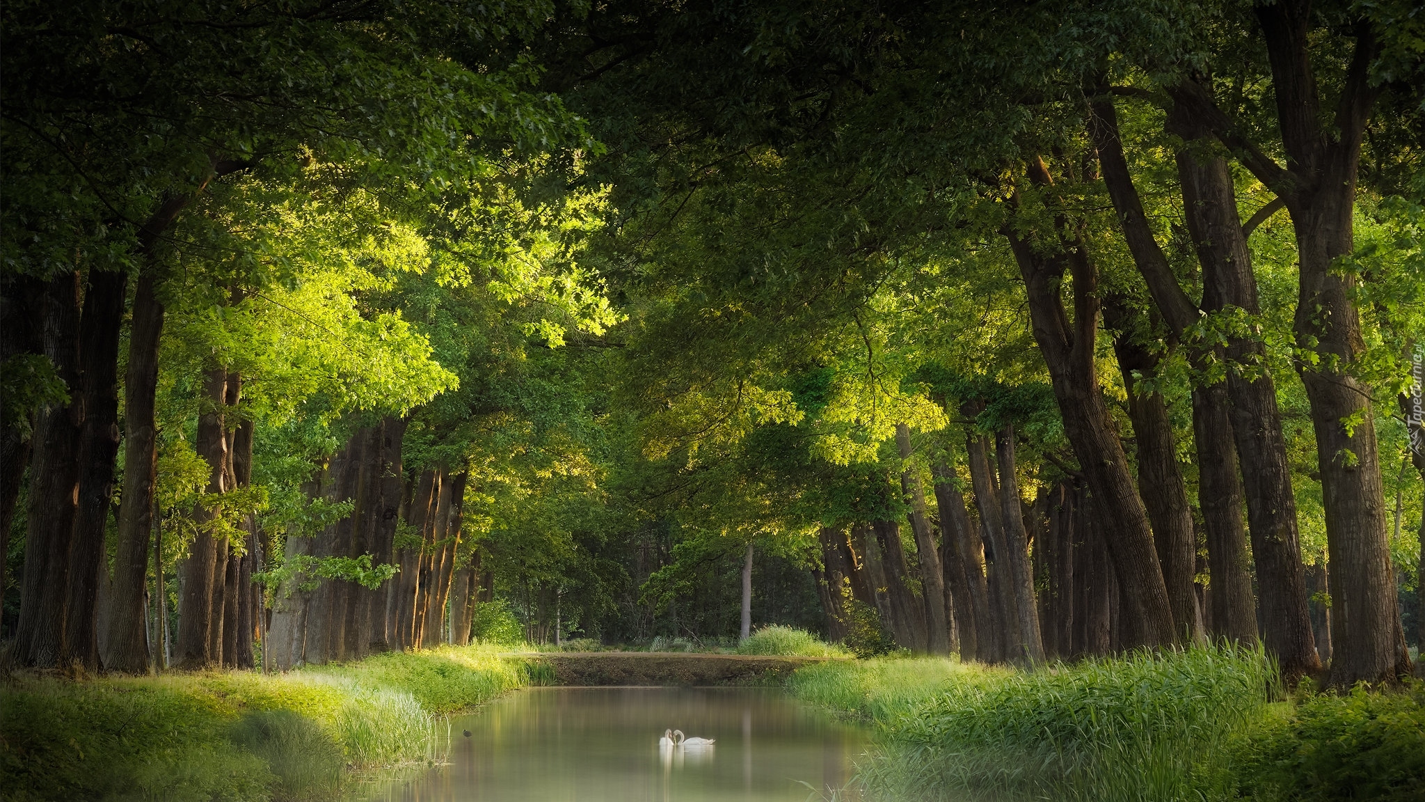 Edytor tapety: Dwa łabędzie na rzece w lasie