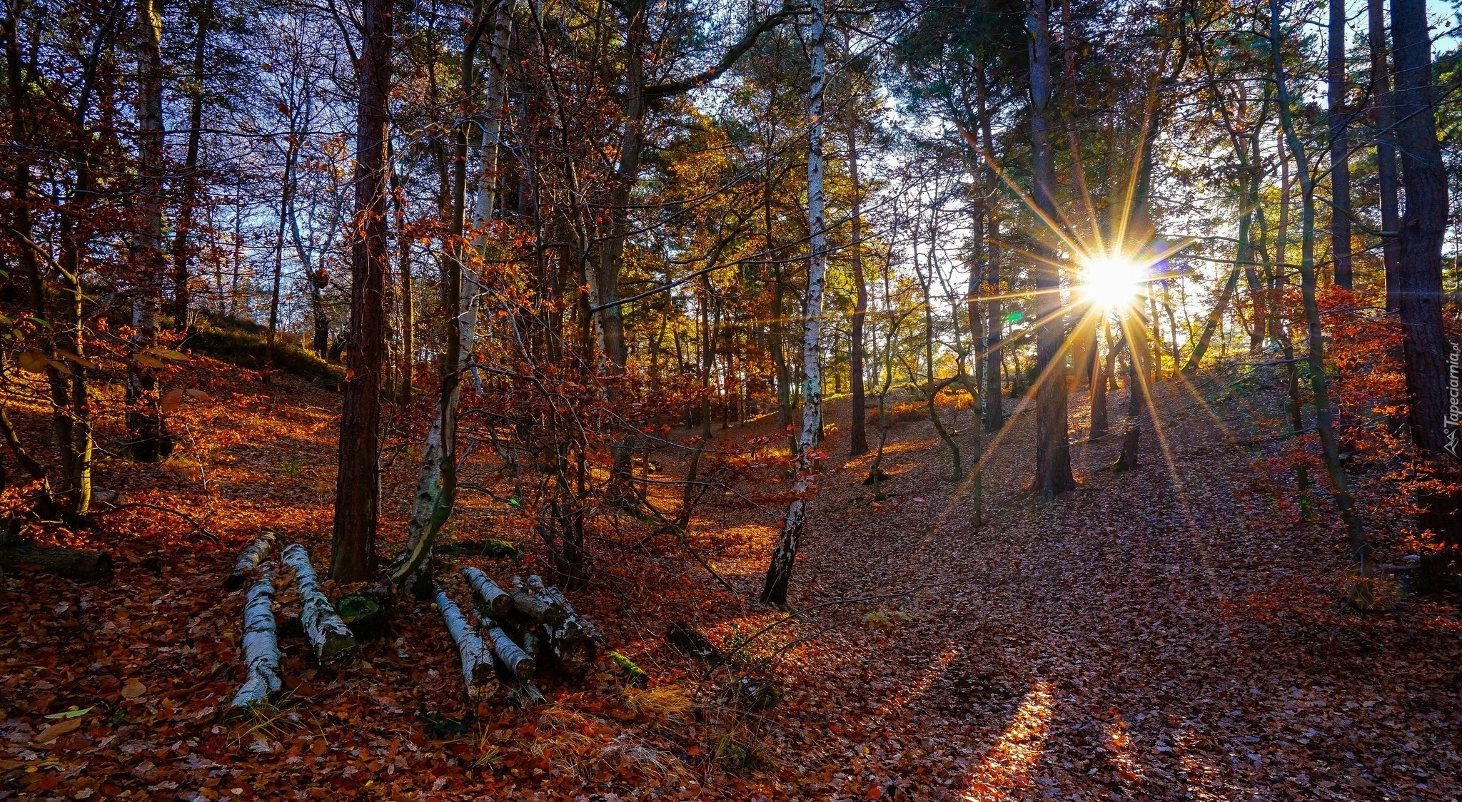 Edytor tapety: Opadłe liście pod brzozami w promieniach słońca