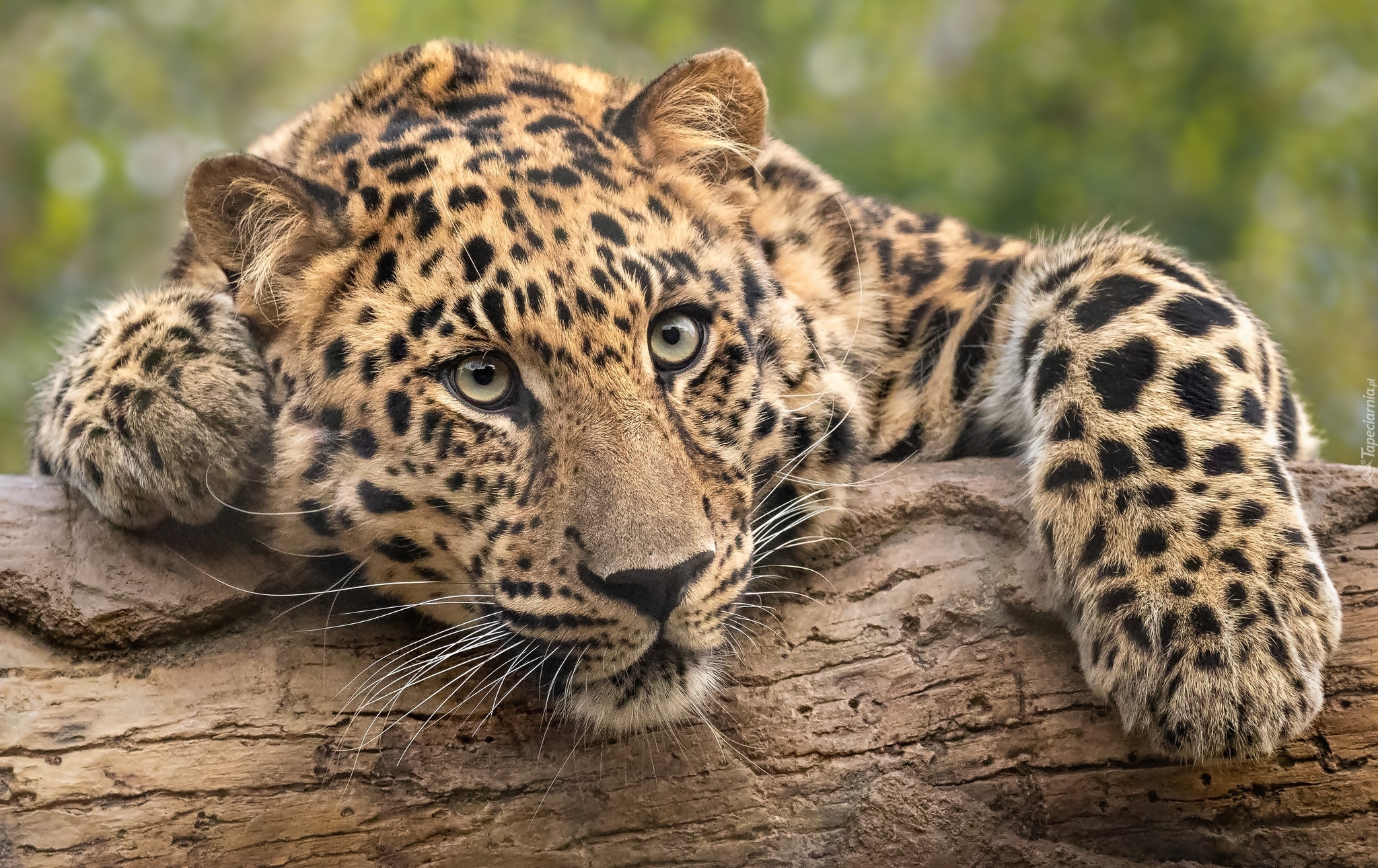 Edytor tapety: Lampart oparty o kłodę drzewa