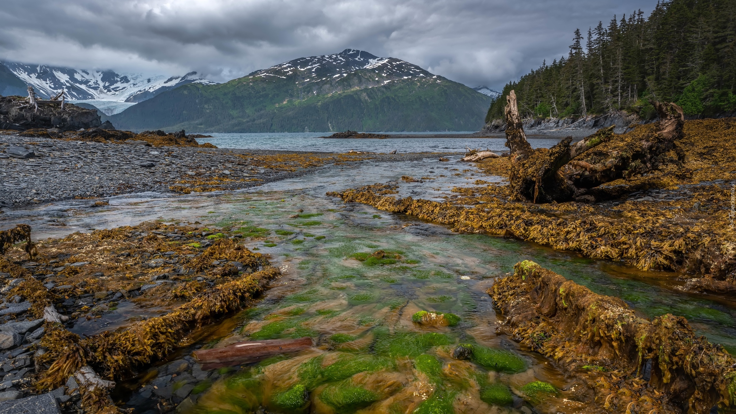 Edytor tapety: Kamienisty brzeg rzeki z widokiem na góry