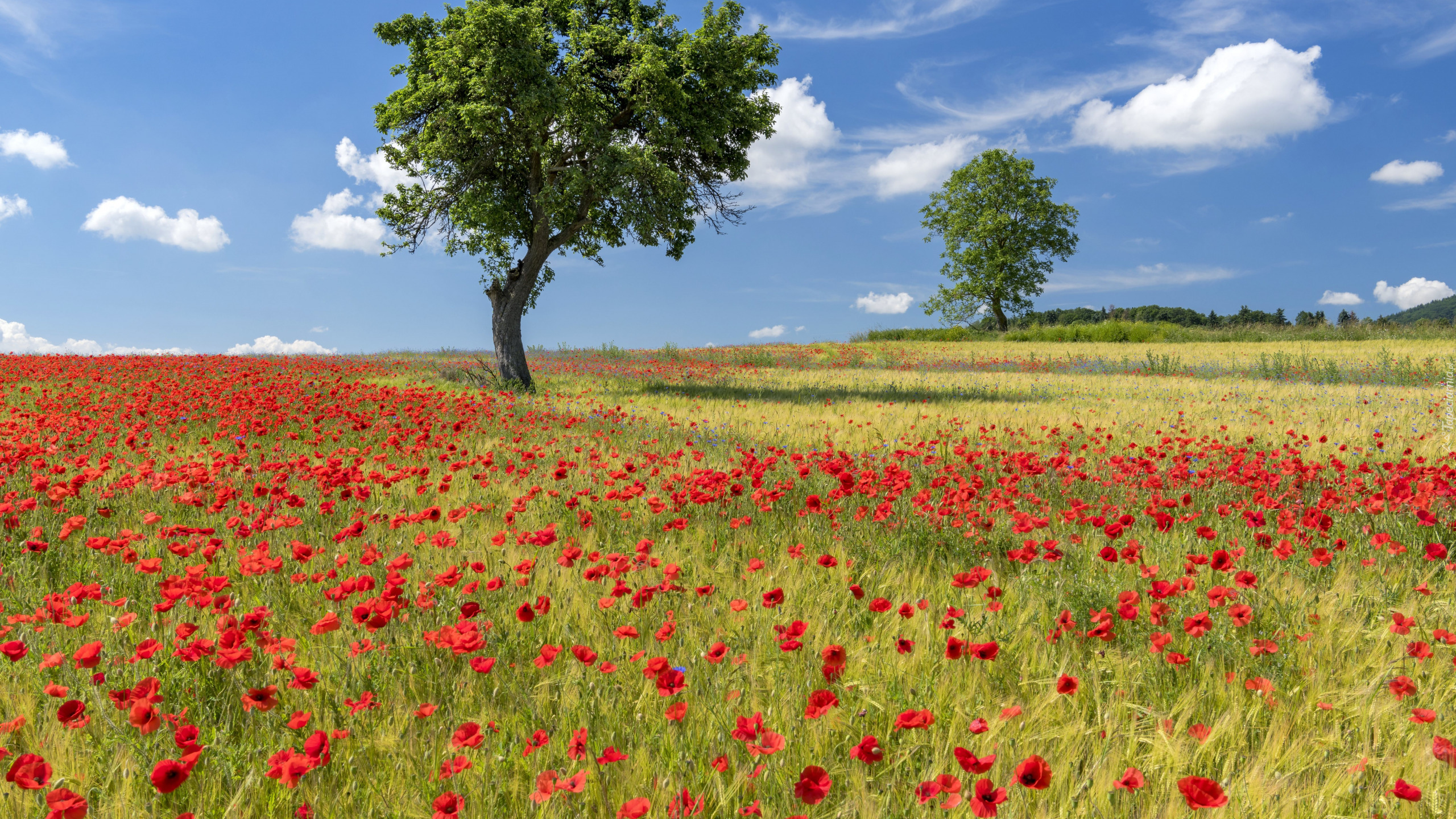Edytor tapety: Dwa drzewa i maki na łące